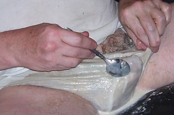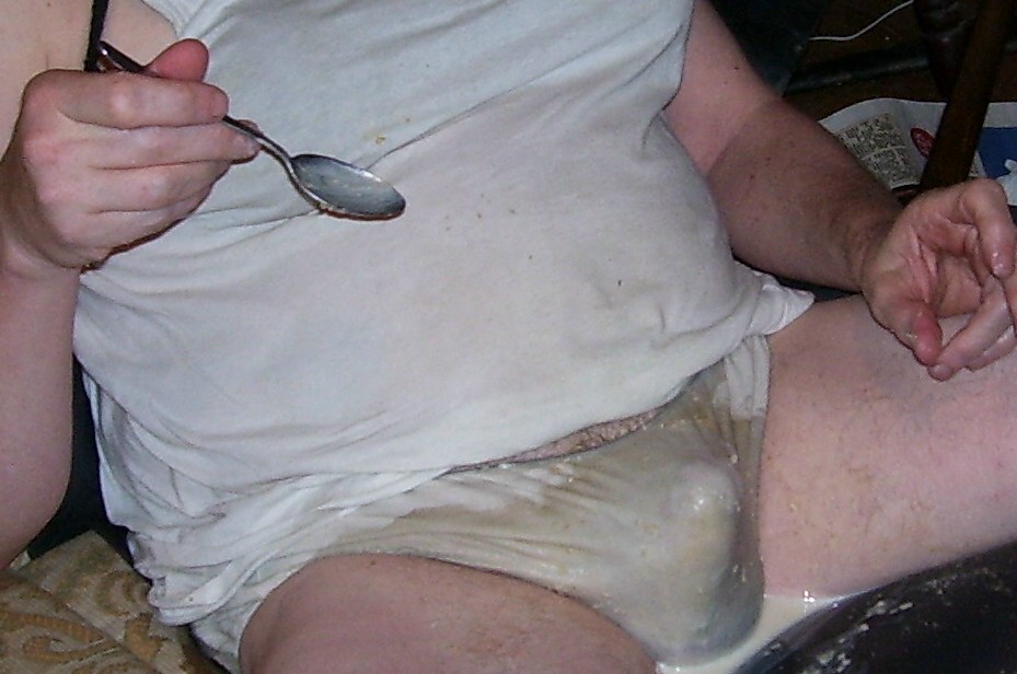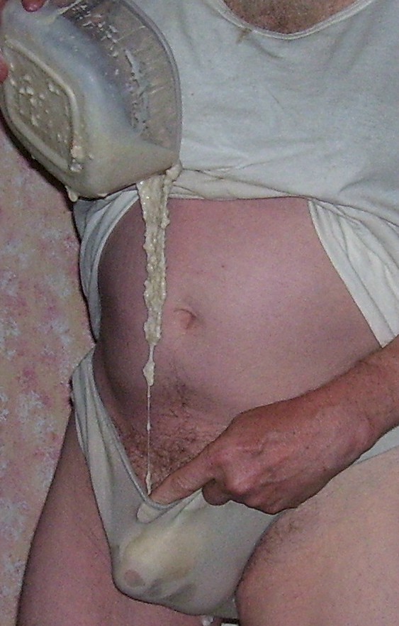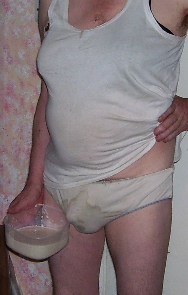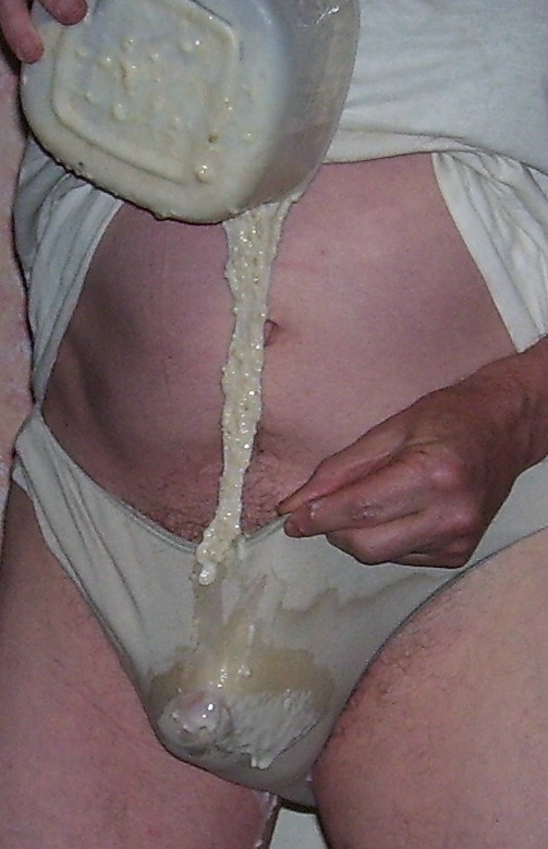 On Easter Sunday afternoon I did don my usual sploshing gear, and after watching Spiderman ii I filled my knickers back and front with nice, healthy (unsweetened) porridge. I append pictures before I sat down to watch an evening’s telly, in fact about four hours of soft sensation.