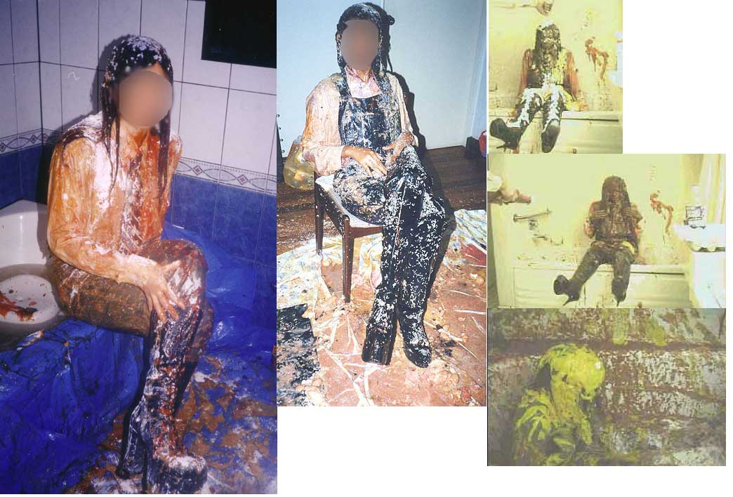 Here is one more I found that shows my favorite outfits to mess in. On the left is shirt, tie, and pants tucked into black platform boots. Then in the middle and on the right is overalls and thightboots messy. The video on the right is very very nice. This girl gets pied and creamed, drowned in ketchup and syrup, then flour and red syrup. She cackles like a chicken in the tub as eggs are being smashed on her and she wallows in the slop fully clothed in her overalls and black thighboots. I wish there were more videos like this.