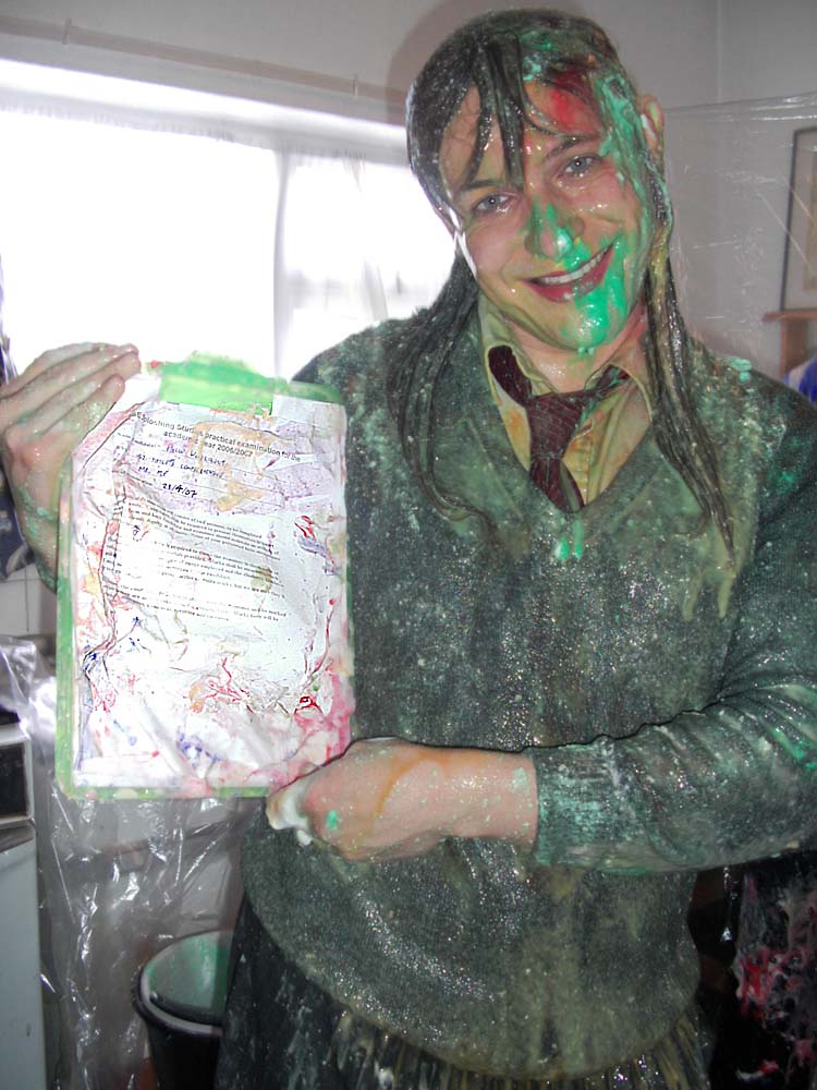 In section 2, the candidate shall change places with the examiner and be marked on how well they are able to take a similar gunging back. Marks here will be awarded for messiness, gameness, taunting and cuteness.