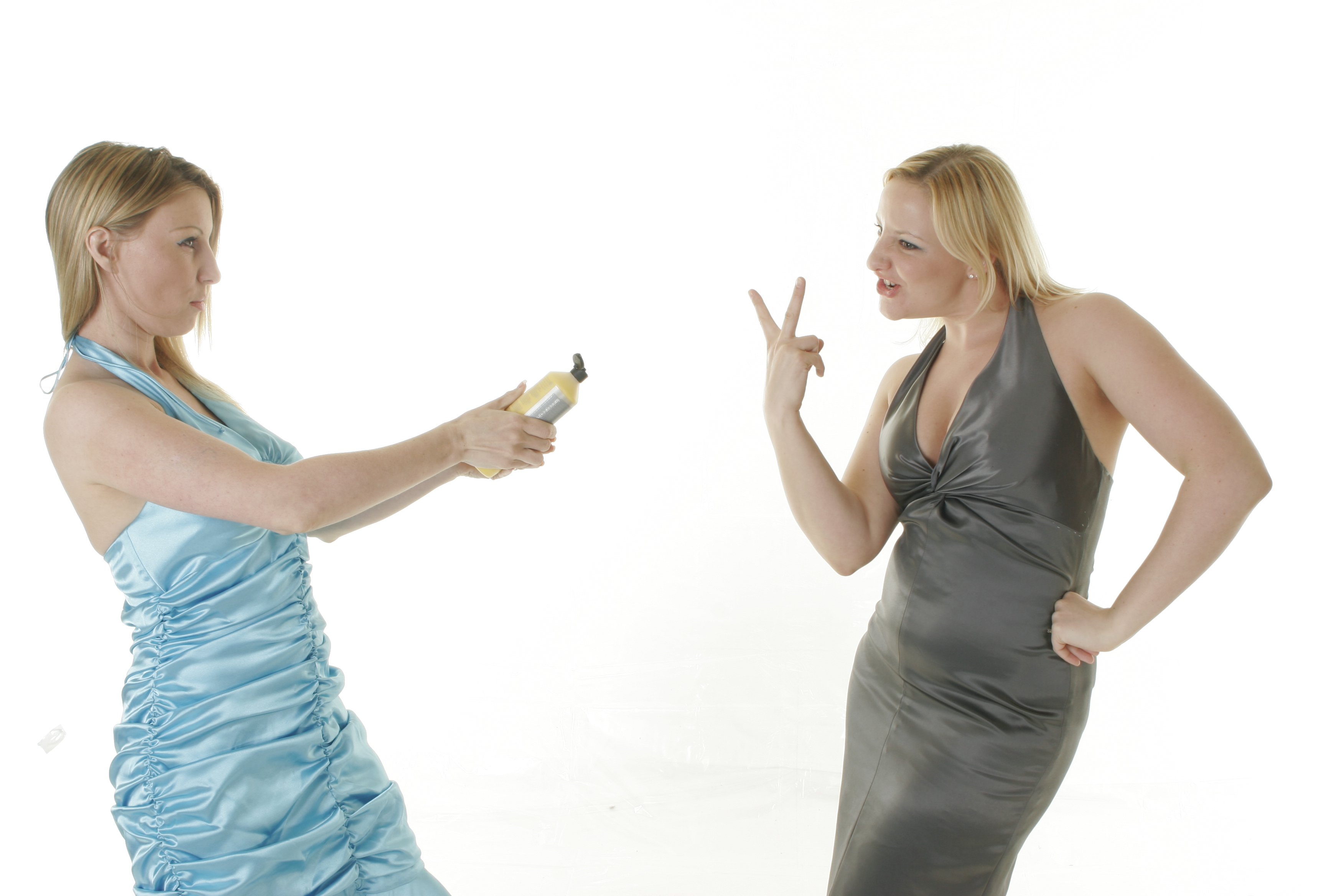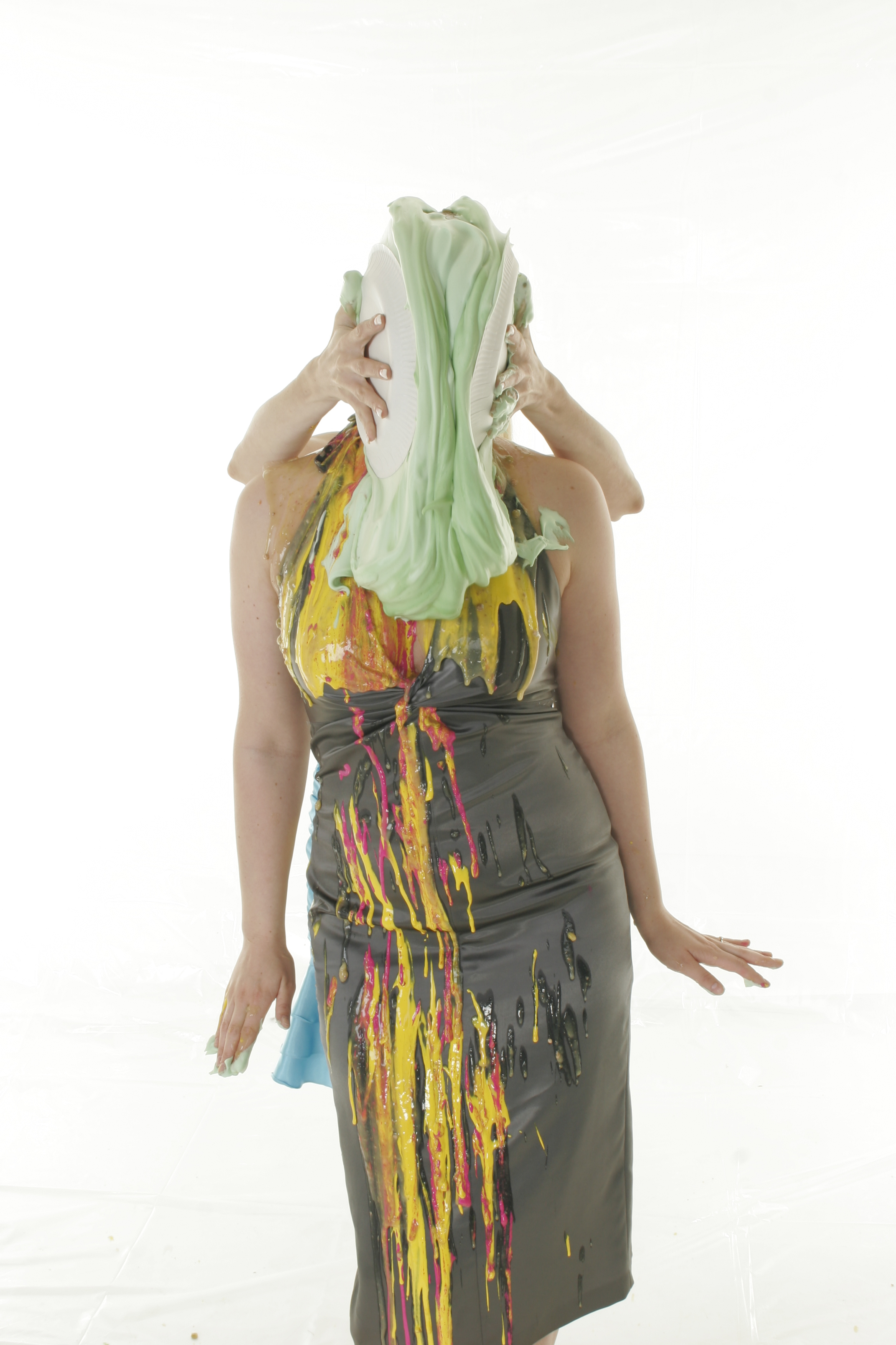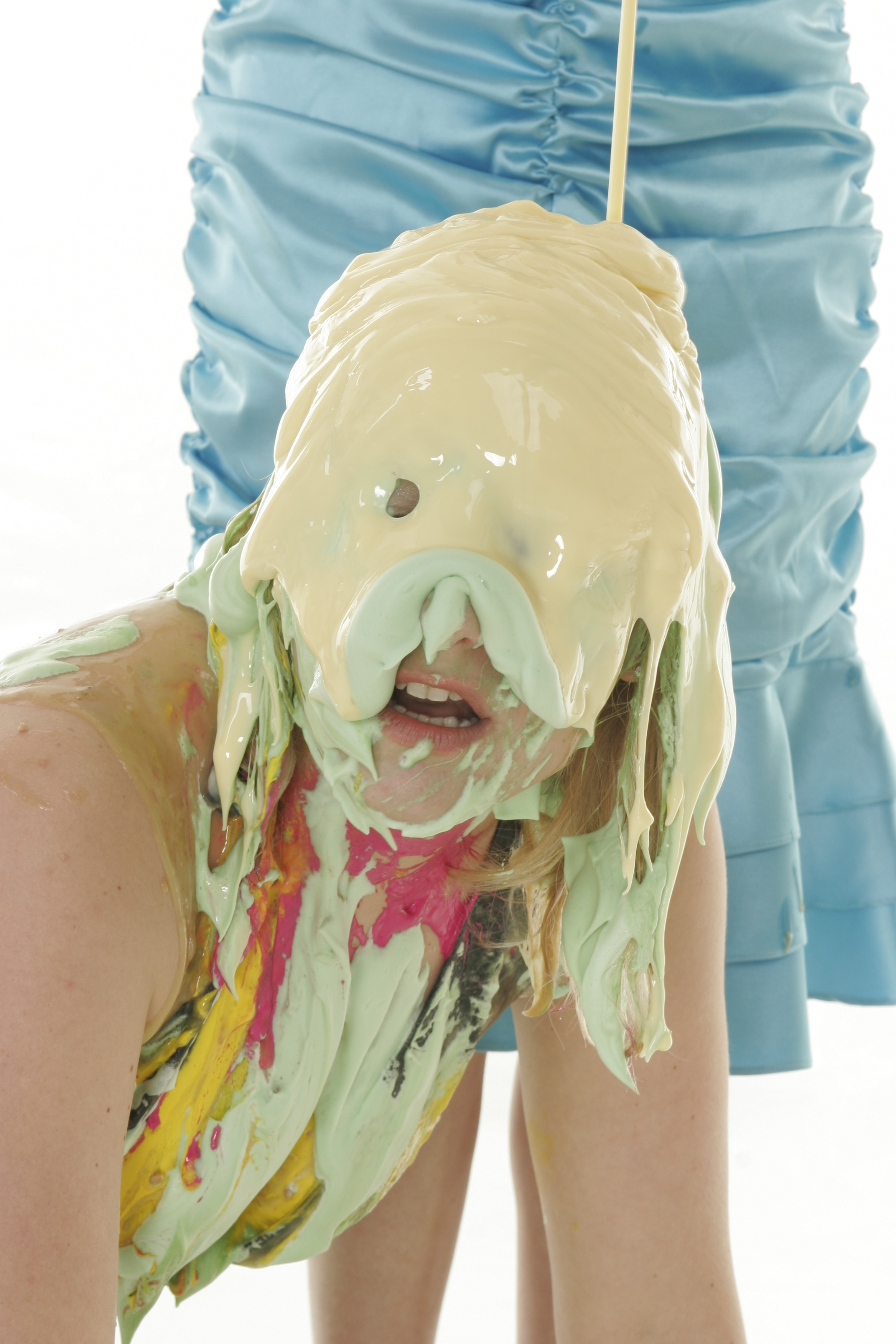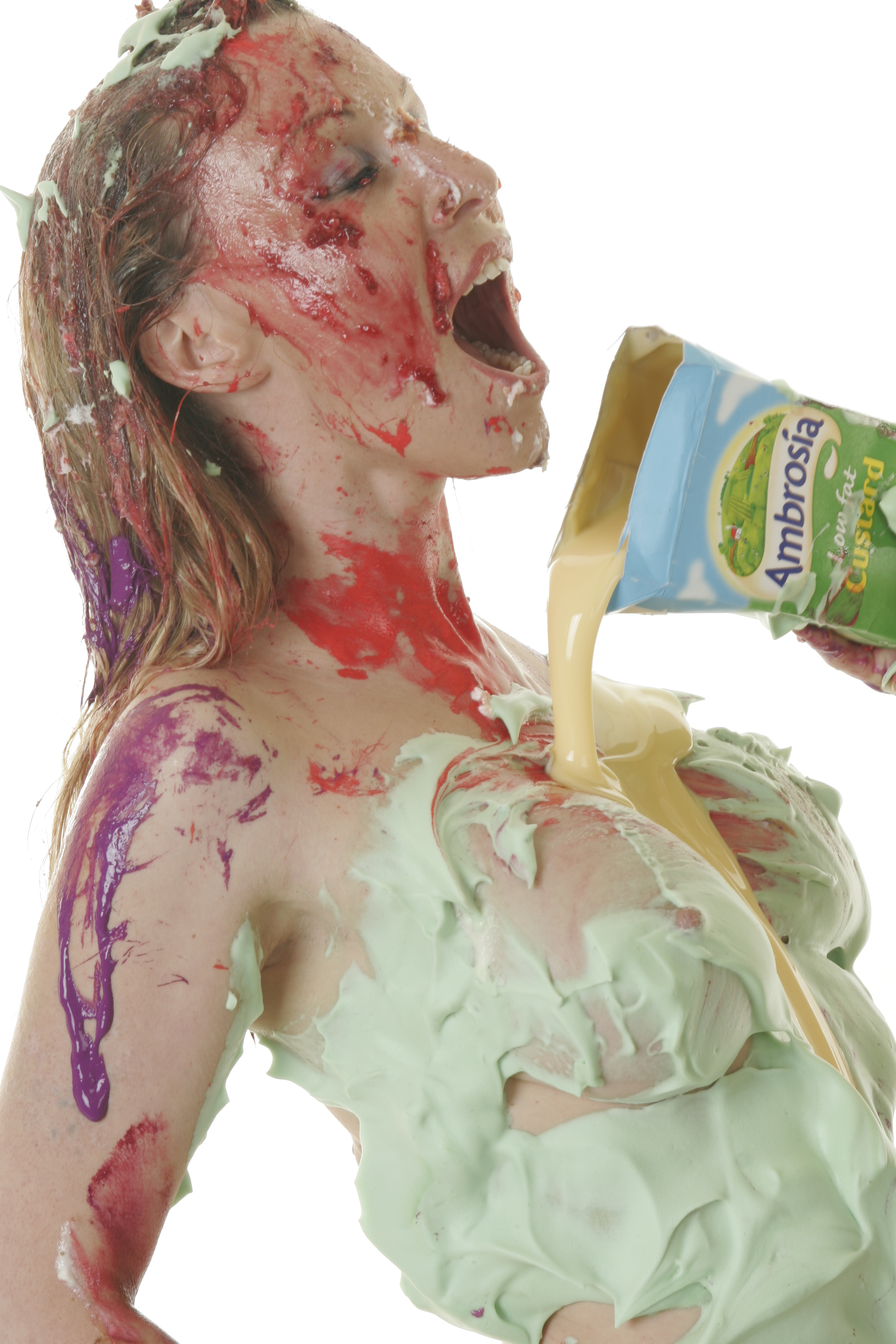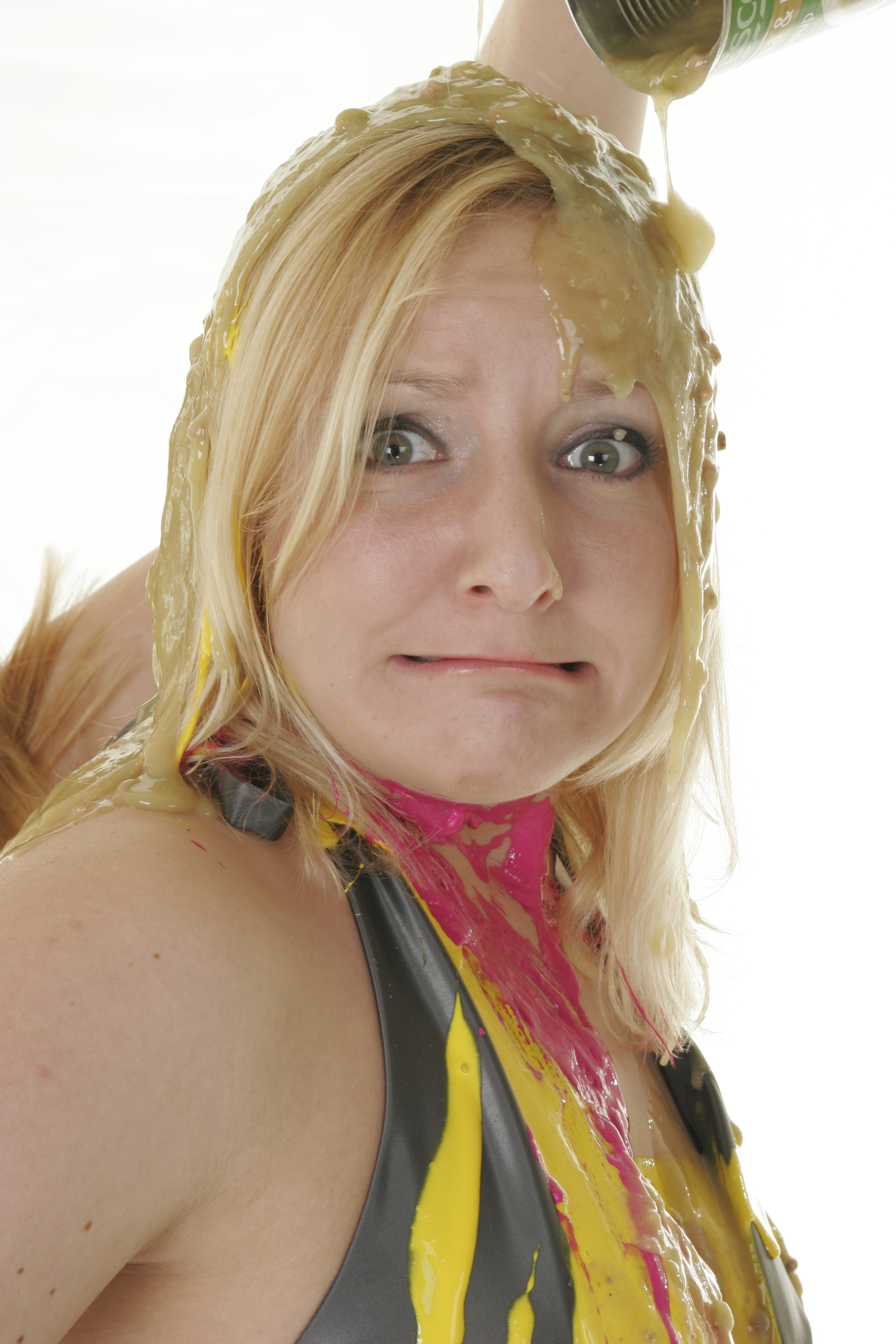We decided to dress up in some fetching sexy evening dresses, then she spoilt the look by chuffing away on a cigarette, so I stubbed the bitch's fag out & soon wish I hadn't when I got a big squirt of yellow paint all down my tight silky dress! If that wasn't bad enough, she started to totally cover me in all sorts of gross things! She smacked big foam pies either side of my head, custard down me, a big yukky bucket over the head, golden syprup filled my knickers & then I got my own back!