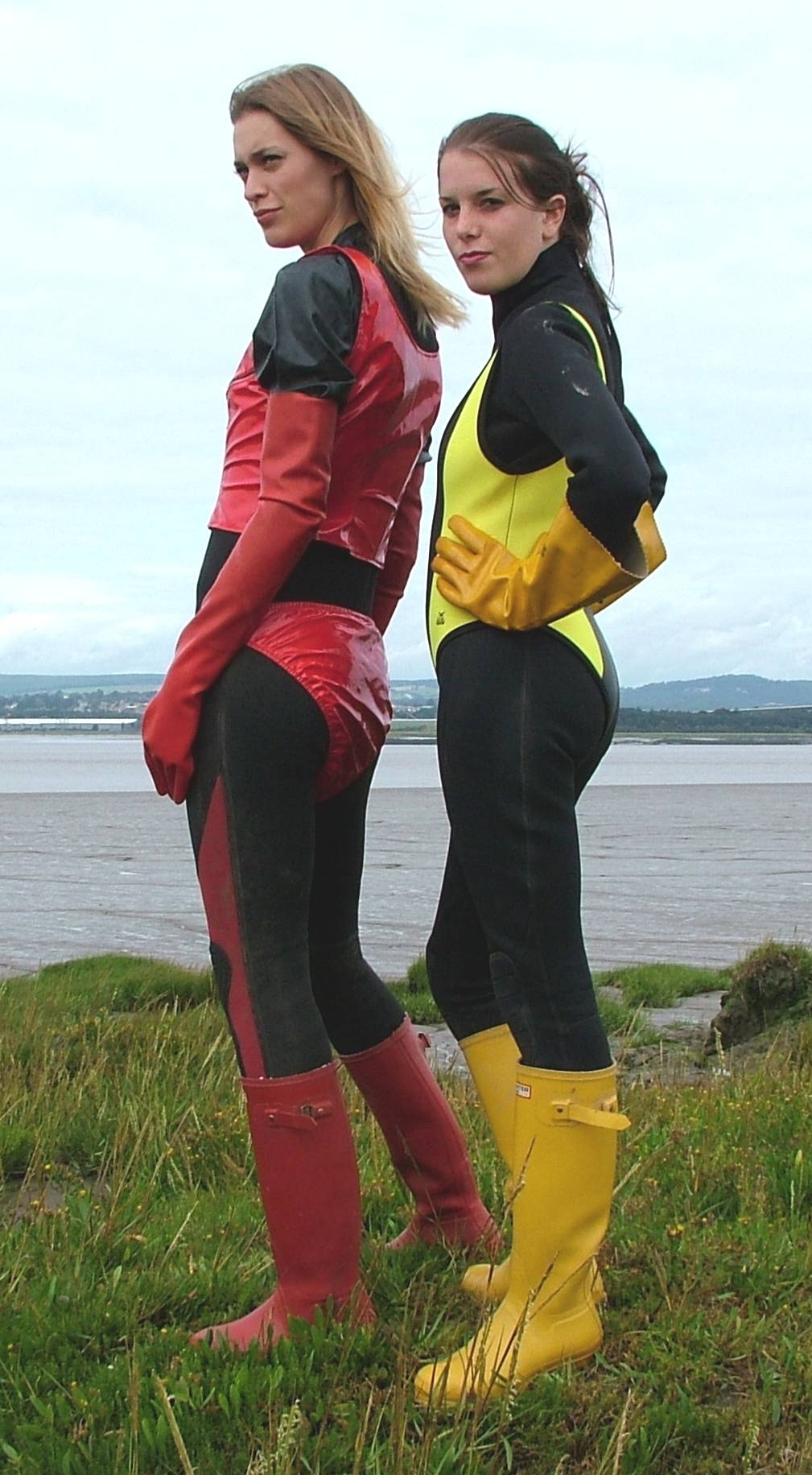 Here are two pics of some girls in pvc catuits and boots starting off clean and getting very muddy...