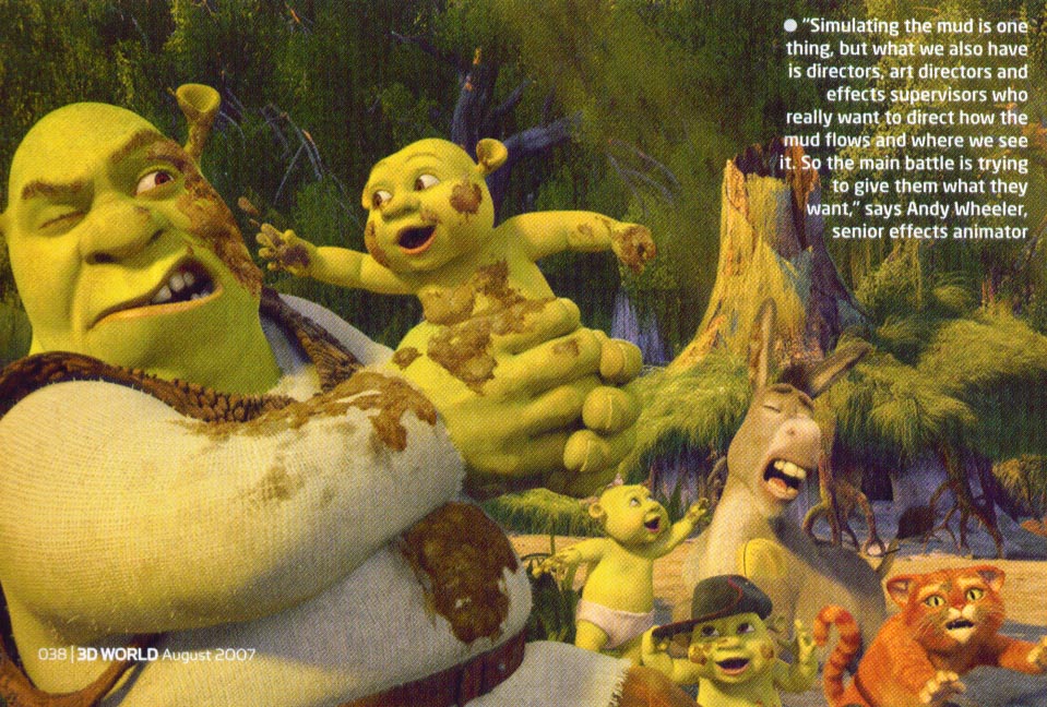 Reading the latest issue of 3D world magazine I came across an article about Shrek 3. The article looks at a few new 3D techniques used in the film including (interestingly) how they made the scene with Shrek wallowing in a mud pit.