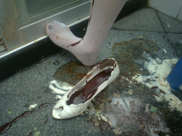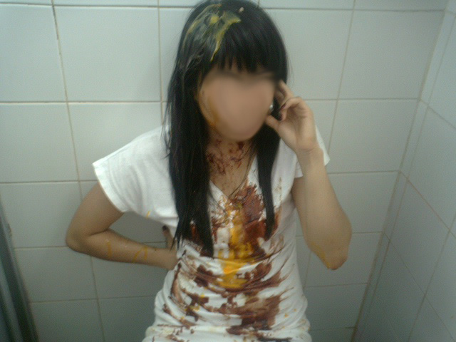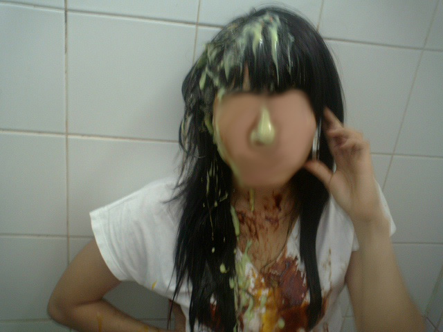 Then I splatted her with some raw eggs. The green goo is runny custard with food colouring.