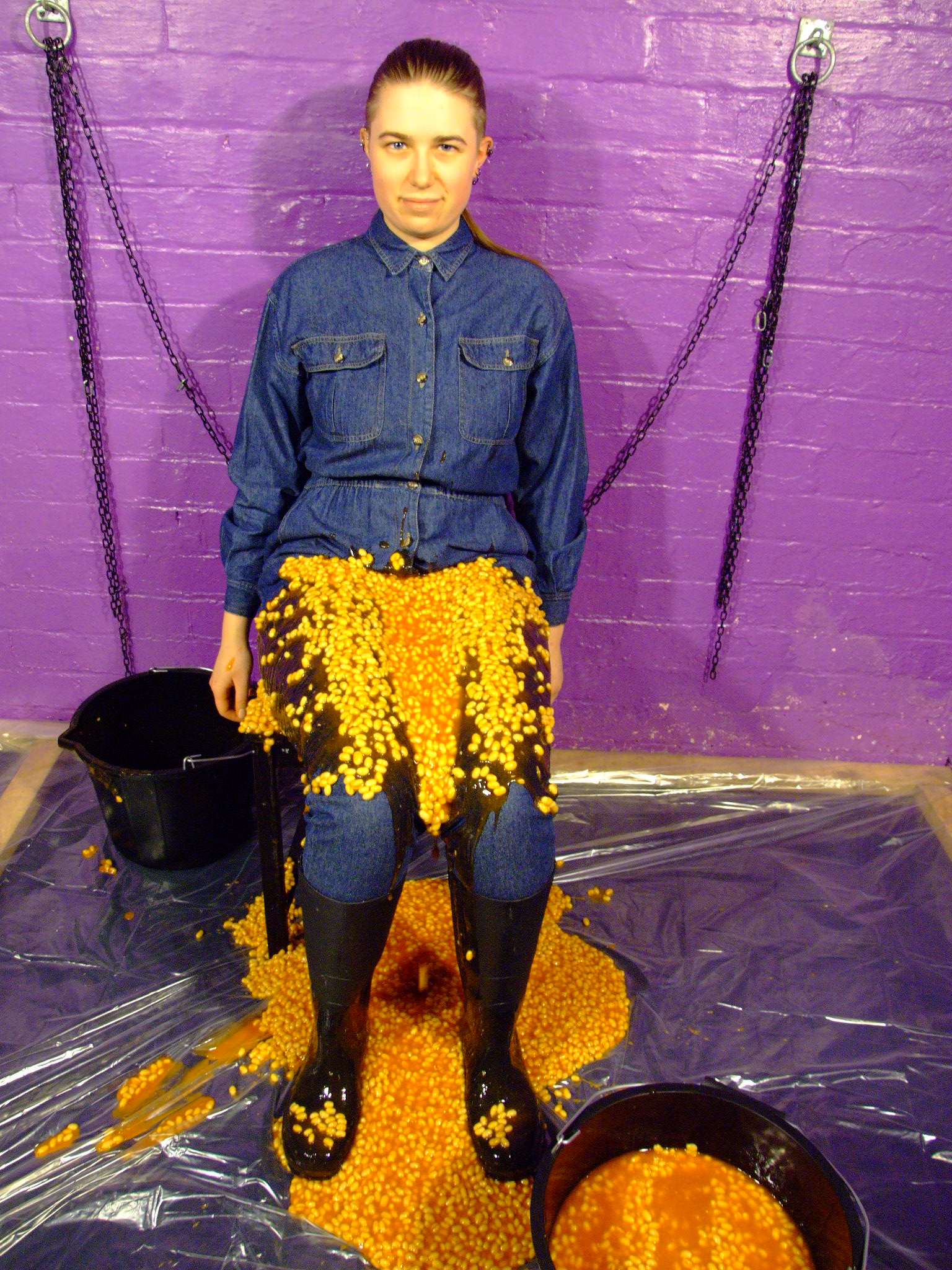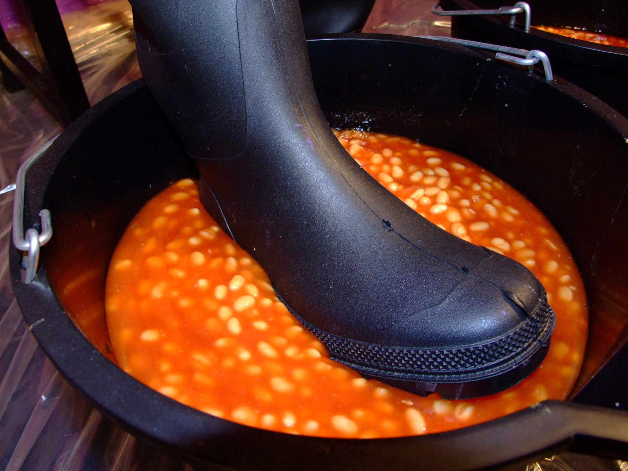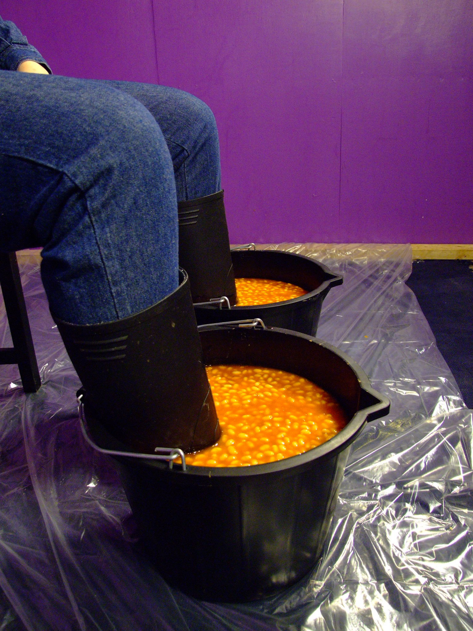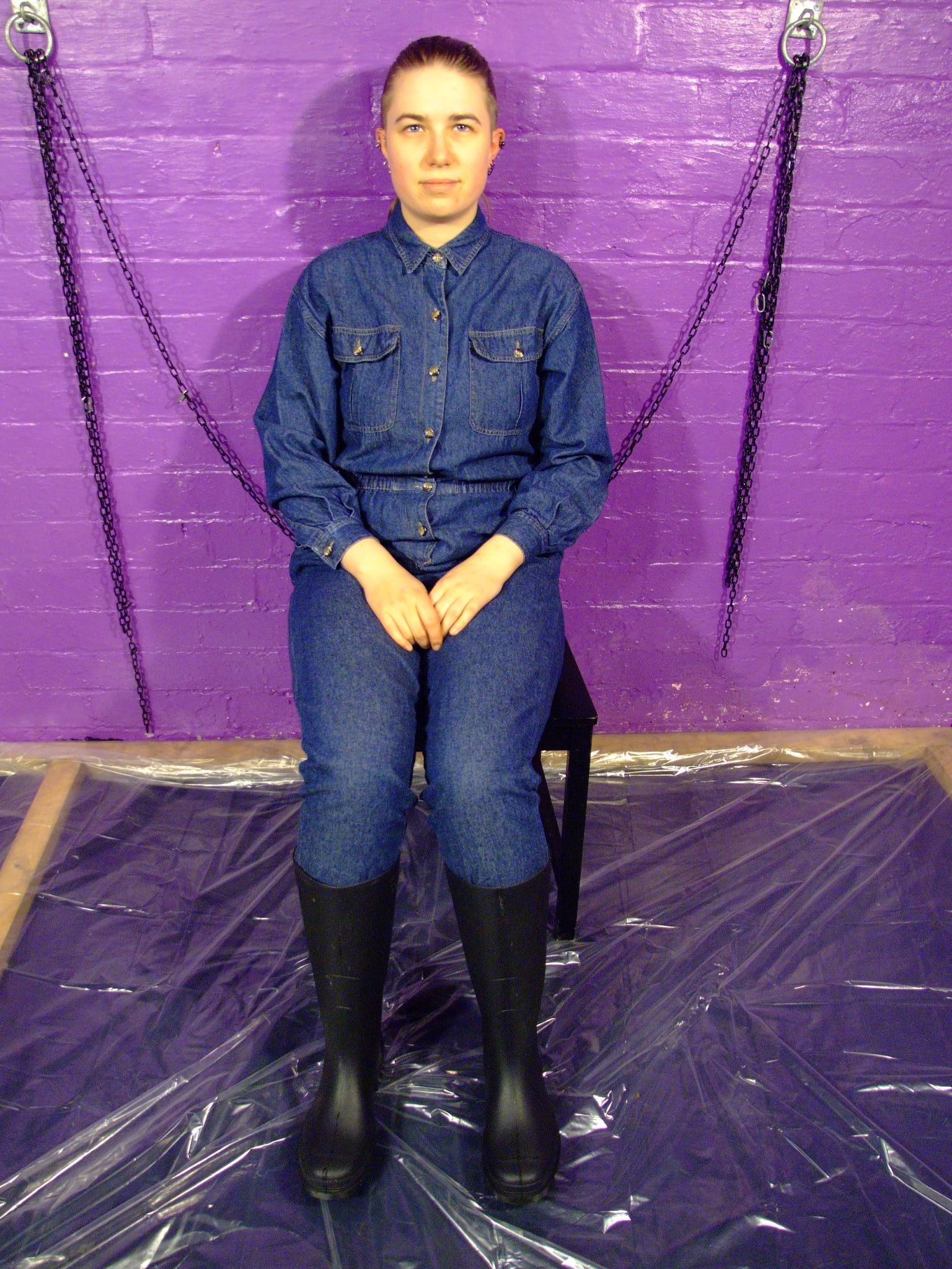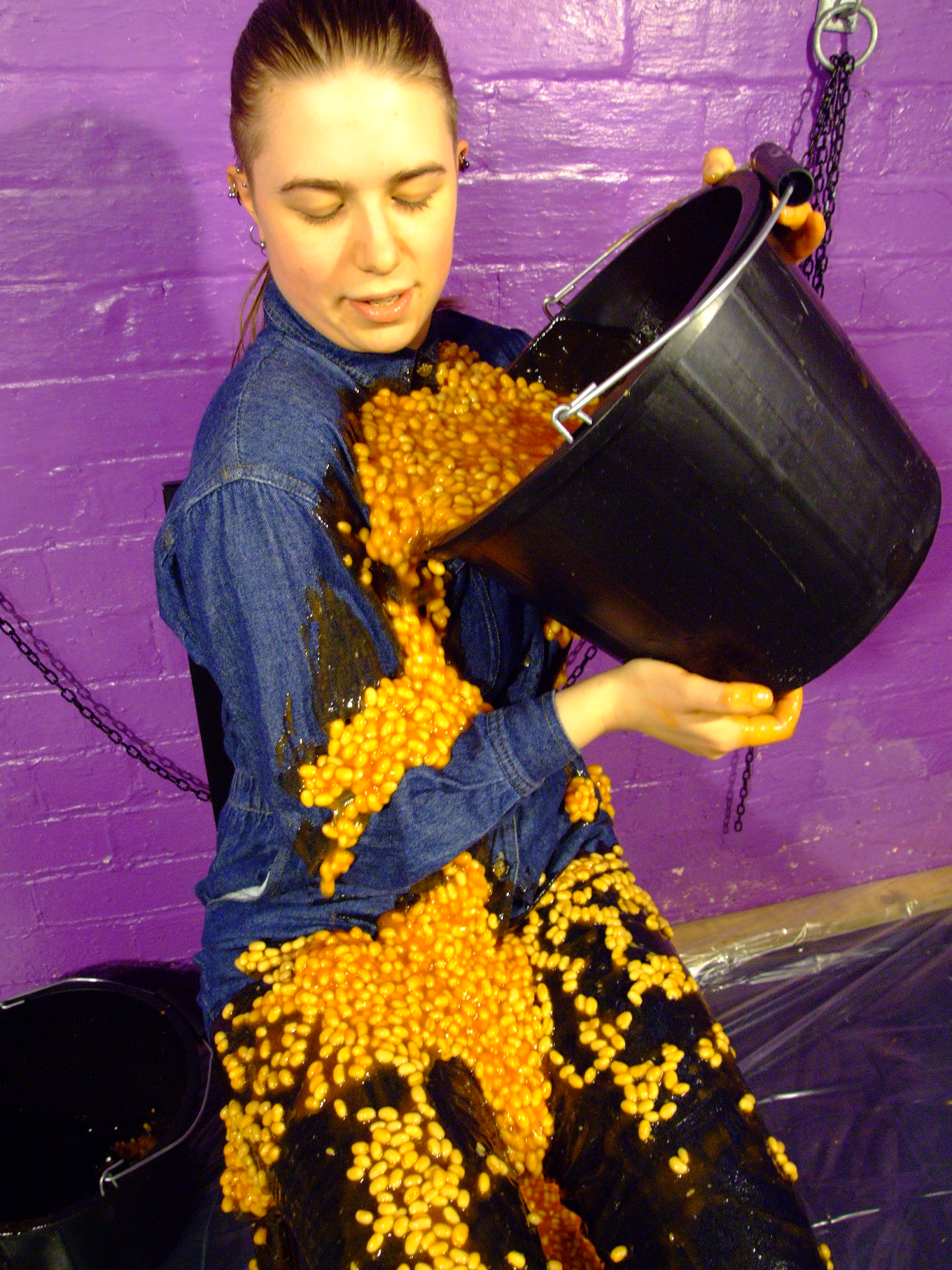 We found this wonderful 1980s denim jumpsuit in Lady Jasmine's wardrobe, Maiden teams it with big black wellies for that authentic "work woman" look, and then gets totally and utterly covered in baked beans from two huge buckets!