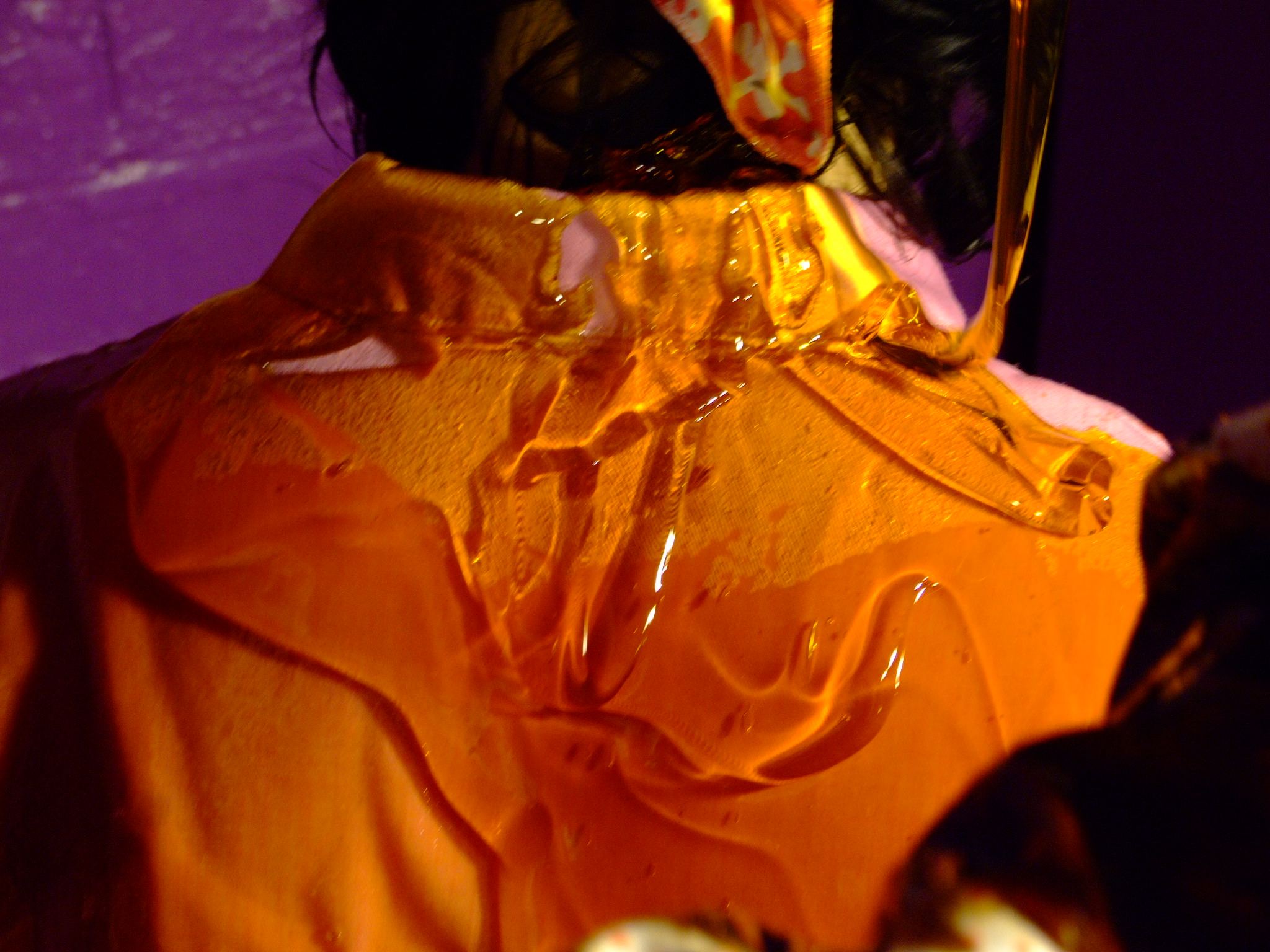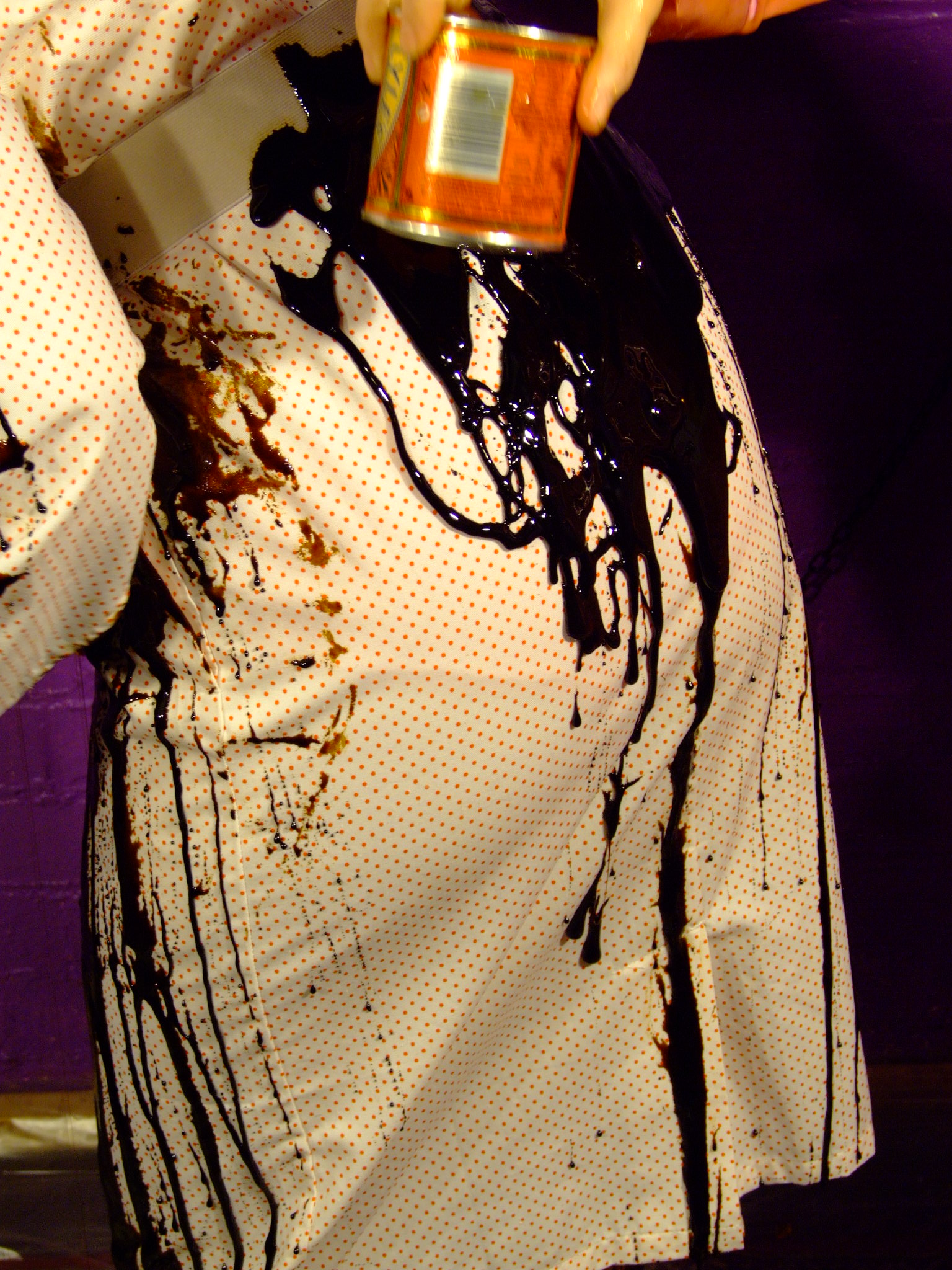 Of course like any superhero, Lady PP has to test her powers before venturing further, and so a barefoot Maiden the Slave Girl, dressed in a 90s style Tesco white and red dress, and little else, provides her with some practice, thick black treacle engulfing the crisp uniform dress.