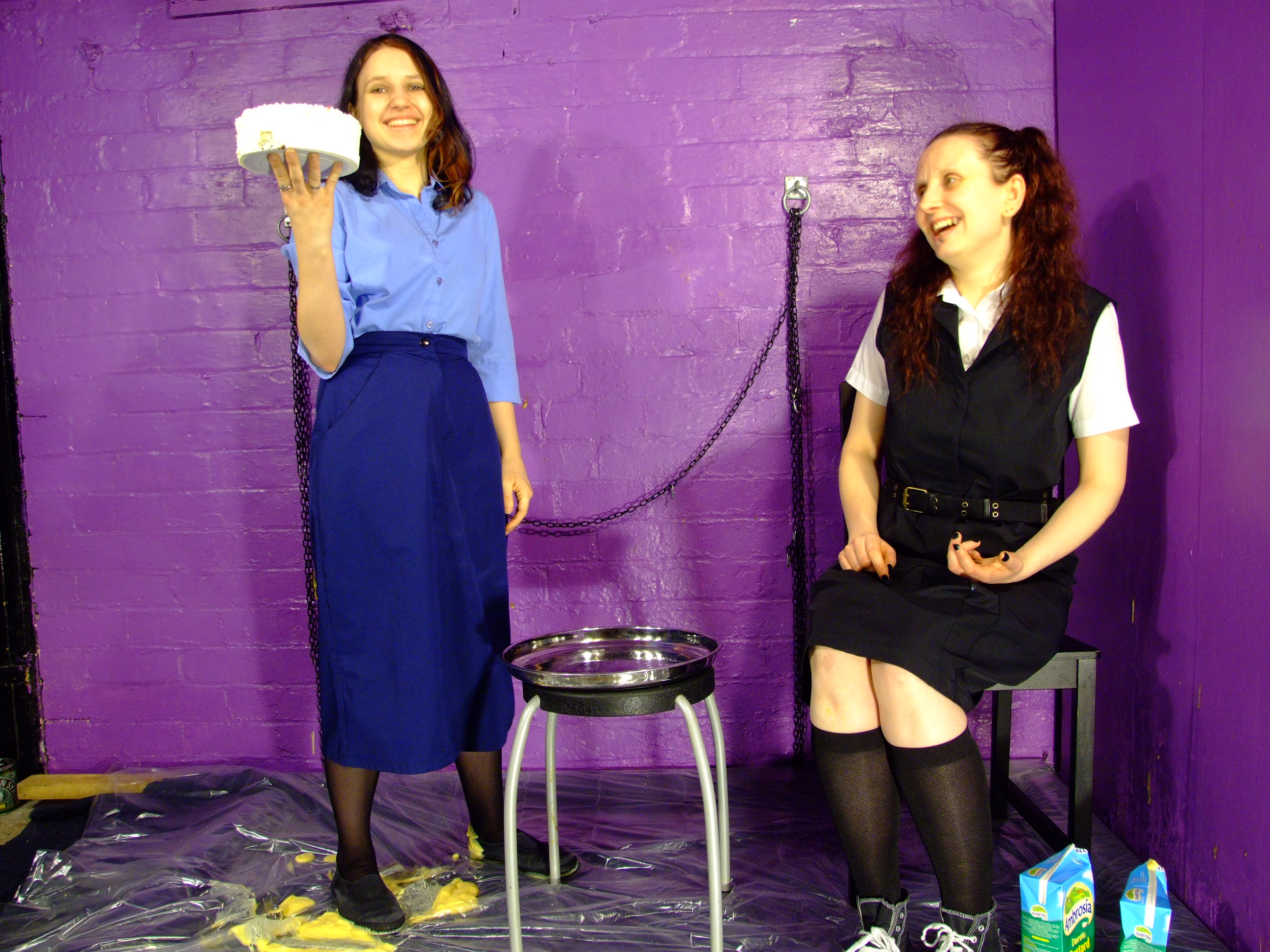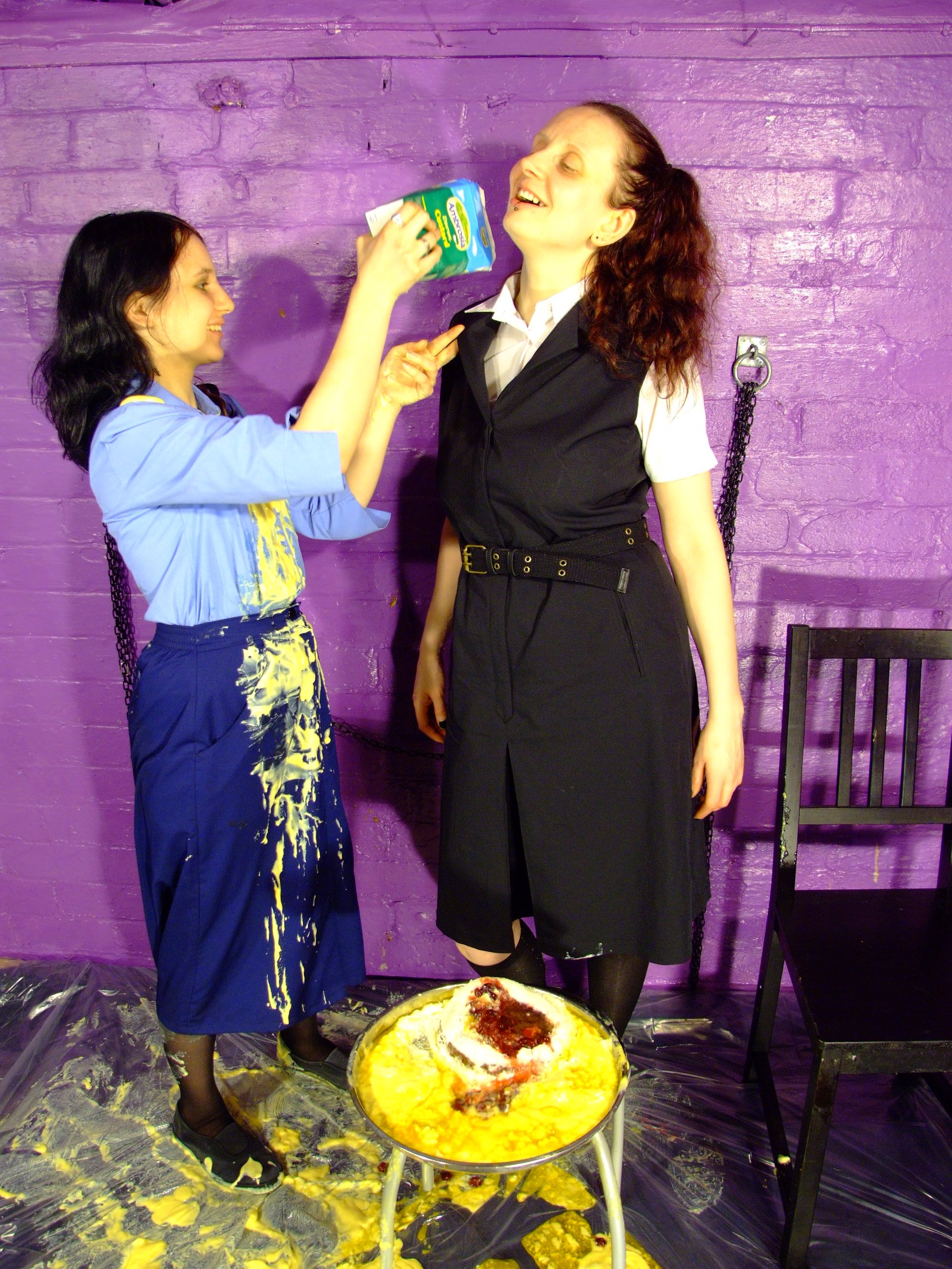 It starts subtly and carefully. Both ladies take their seats, and then Lady Amaranth pulls out the elasticated waistband of Felicity's uniform skirt, and fills the back of it with custard. Once the skirt back is full, Felicity is instructed to stand up, and all the trapped custard flows down the inside of her skirt, over the backs of her legs, and dollops down onto her shoes and the floor about her feet.
