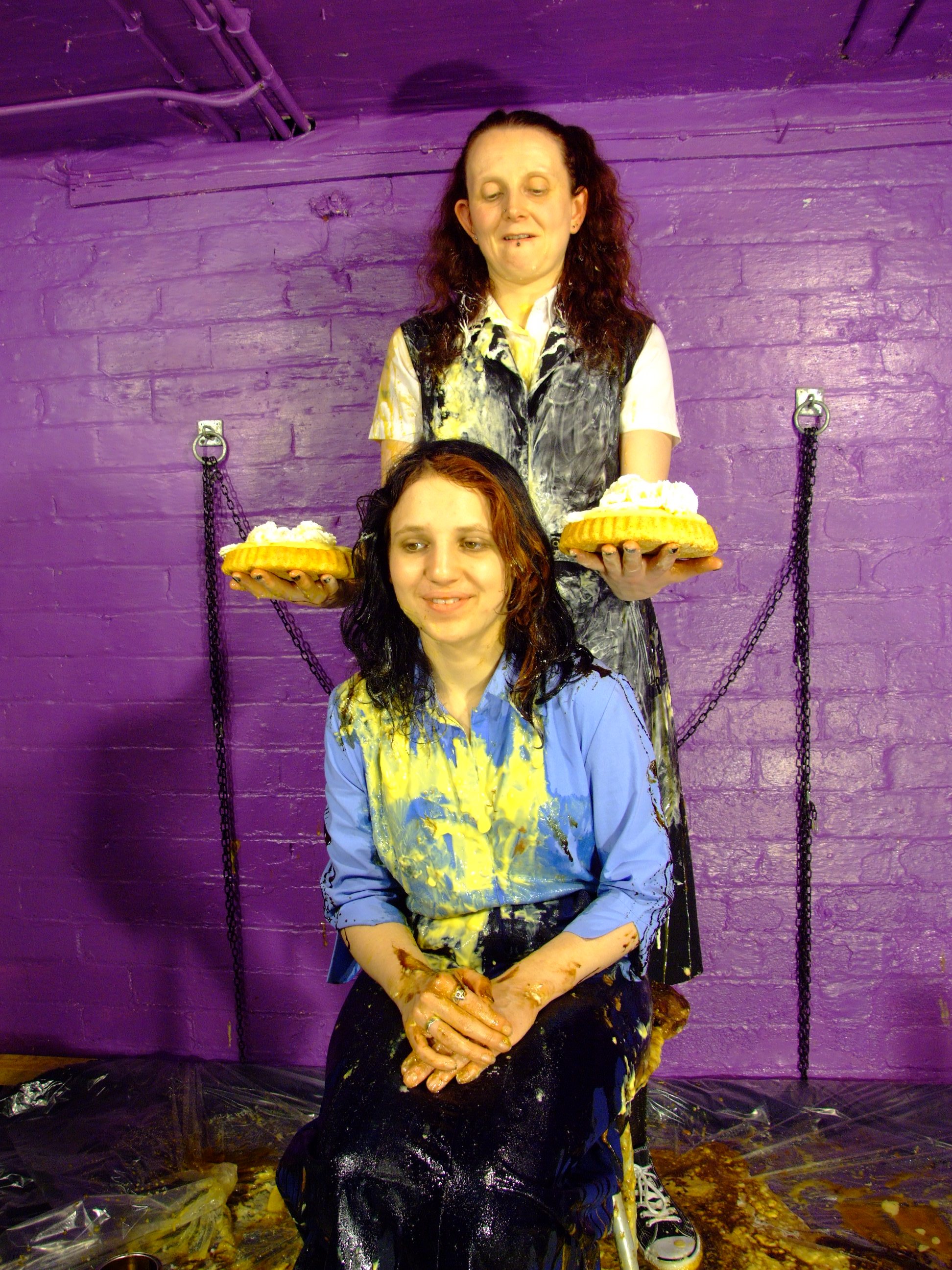 Felicity, custard still dripping from inside her skirt, then acquires a nice large defrosted Black Forest gateaux, which she places on a silver tray, and then covers with custard and syrup, before instructing Lady Amaranth to sit, which she does, "squelch!". Lady Amaranth then stands up, but Felicity isn't satisfied with the results, so more custard and treacle is added, the tray repositioned, and down Lady Amaranth goes for a second squelching. This time the results are better, the seat of her ladyship's dress now properly coated in goo.