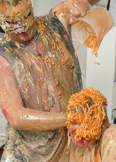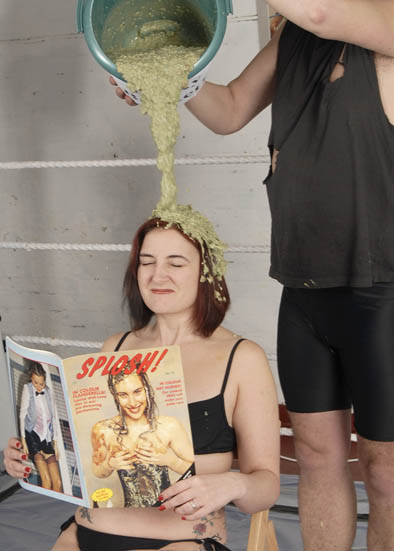He noticed in the corner a huge bucket that Sammi had accidently left behind, full of all the left over slops from previous messy wrestling contests. Ahh this will do thought the Masked Man as he sneaked up behind Dynamo..........