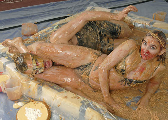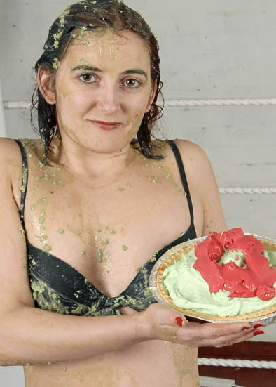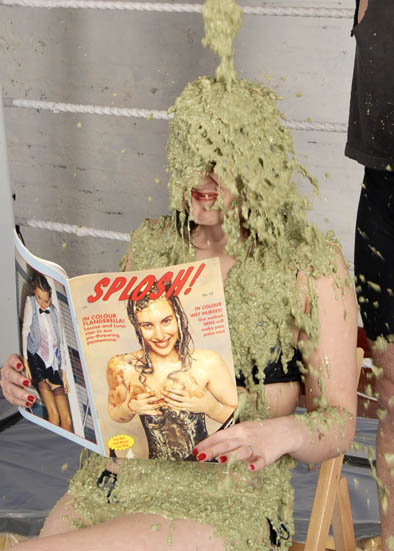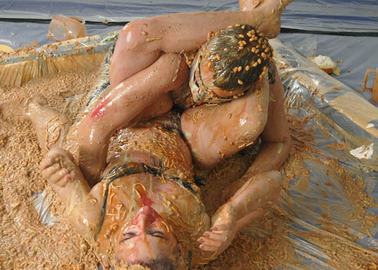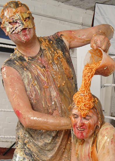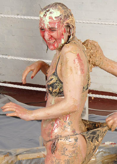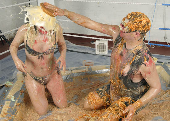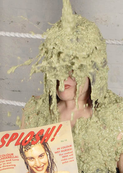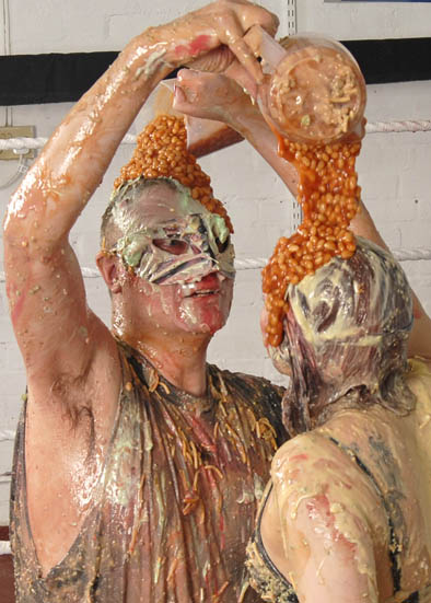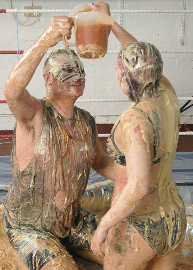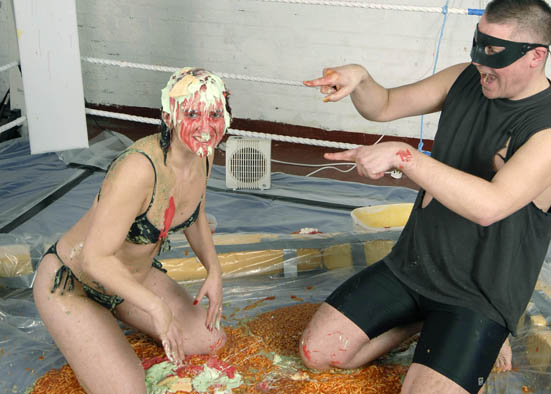 Not sure who won the sploshing round, back to the grappling and the Masked Man made a good start tossing Dynamo back first onto the slop covered mat. Alas this was short lived and before the Masked Man could even consider a pin she came out with a lethal leg lock and the Masked Man had to submit.