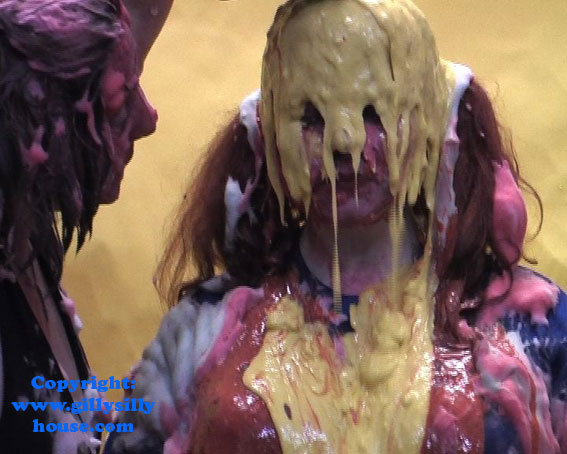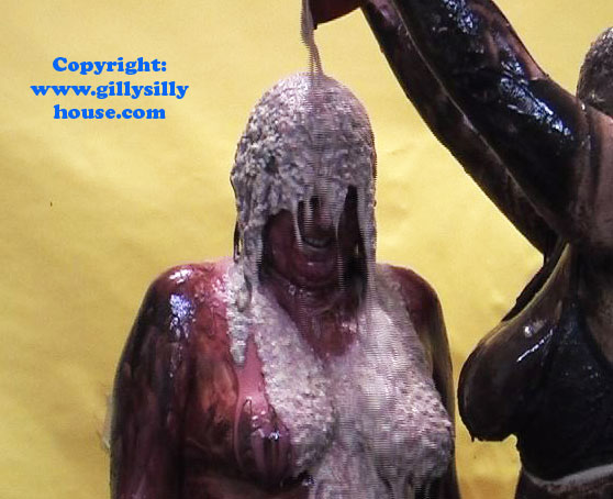 After stripping each other completely, and covering every inch of their bodies (a lot of inches!) our twosome take it in turns to dunk each other's heads in a trough of porridge - before SuperDoll pours it over our supposed heiress!
