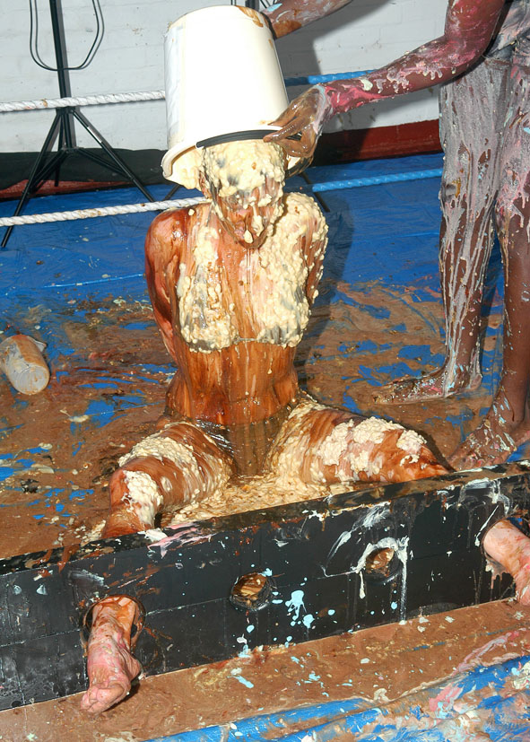 Between the wrestling sessions we played some games. Taz had pied Sploshman very hard in pass the pie but he got his chance to gunge her back at the end of the game when she got the bucket of blue glop in "pass the bucket".