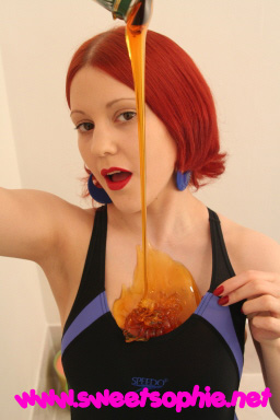 I get really messy in this set in 6 big tins of golden syrup which is first poured in to my swim suit and sexily drips down my legs and on to my bare feet!