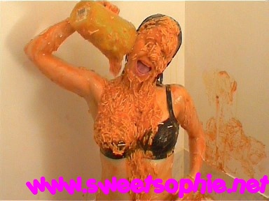 I pour a huge jug of spaggeti over my head and face and it runs down covering my bra, stomach and panties. Slowly rubbing all the mess in, I take of my tshirt and squish lots of the spaggeti mix in to my bra