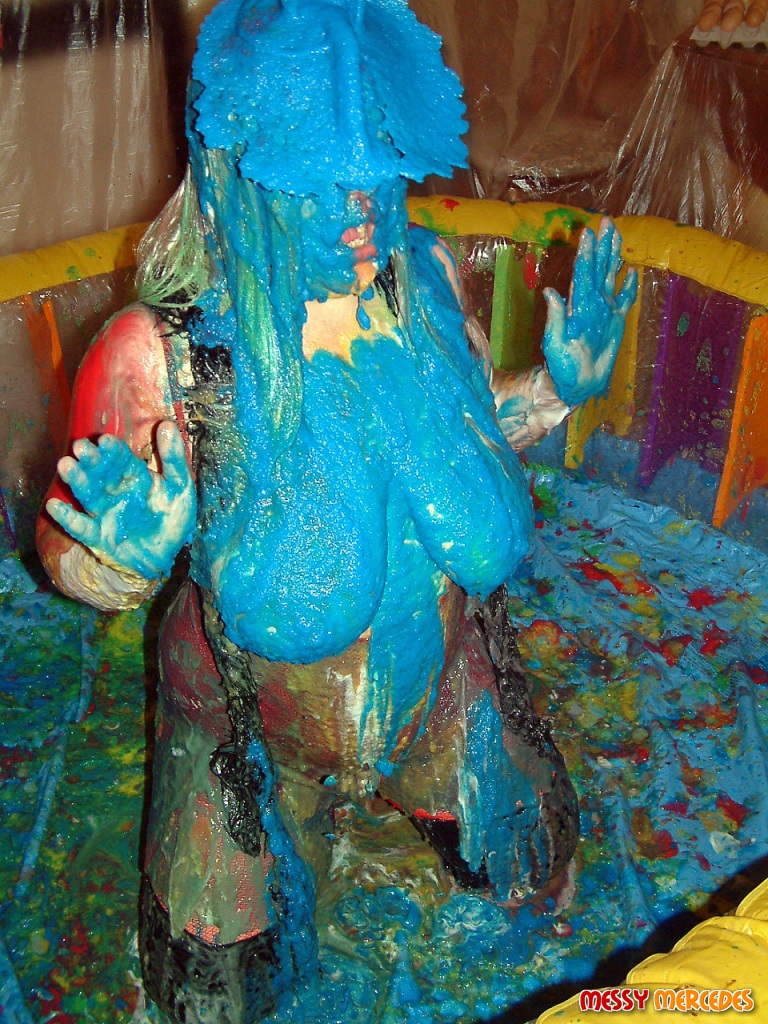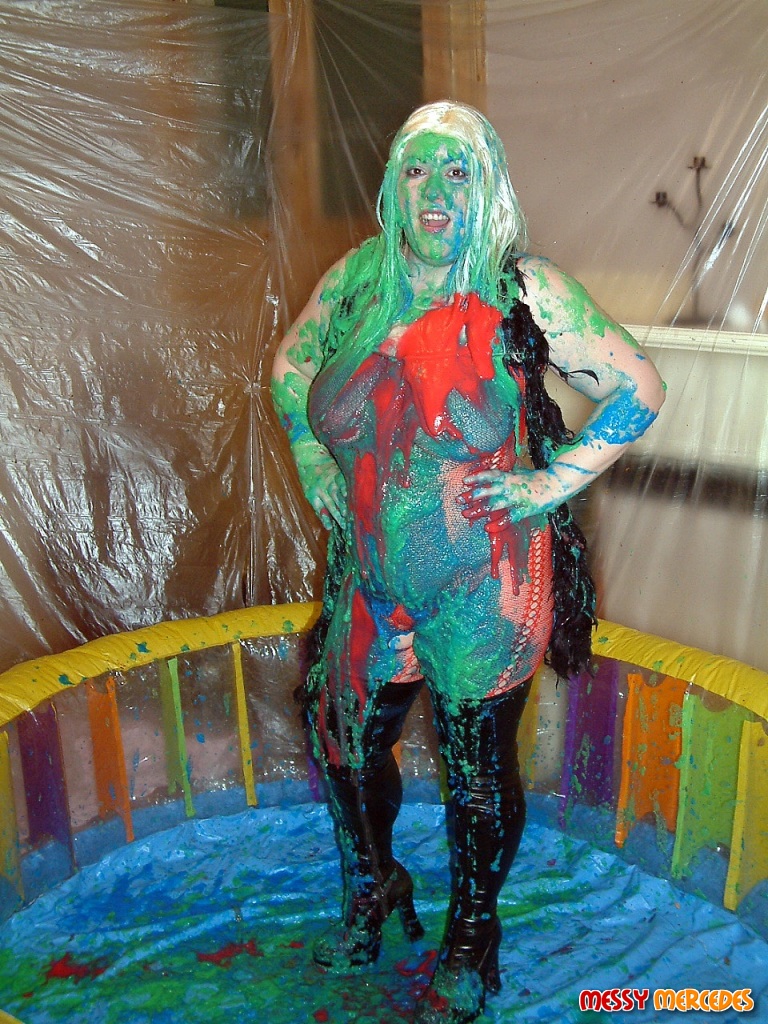 Candy's wearing a red fishnet bodystocking with black thigh boots, blonde wig & black feather boa!! :shock: :shock: See this nutty gal get various coloured gunge thrown at her. :lol: She dips her head into a bucket of gunge & then pours it over her own head. :roll: She also gets it trickled over her & has a cigarette in all the mess too :twisted: