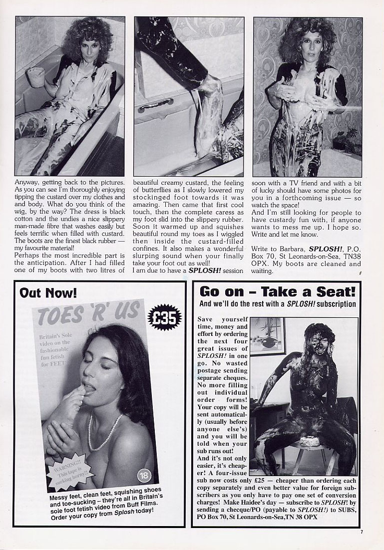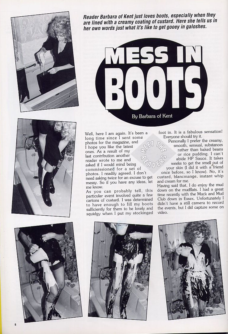Splosh! readers' wives or Meet the Messy Missus as it was called was a regular spot in the mag usually on the letter's page. Occasionally somebody would also agree to be interviewed and we made a spread out of it. Barbara from Kent and her partner were just such a couple. Regular sploshers, Barbara has some great outfits and loved all sorts of mess.