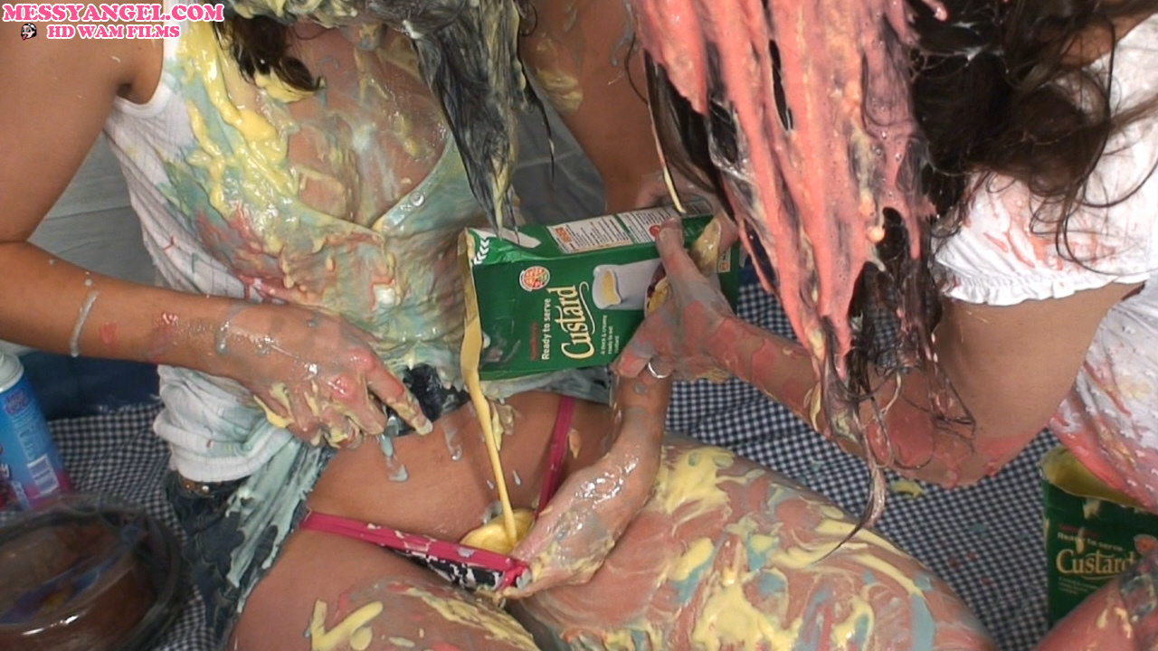You are sure to be in for a treat today as we join Jess and her best friend Lola (dressed in lovely white cotton tops & demin skirts) for a lovely summer’s picnic. But when Jess flicks some custard at Lola it soon becomes more messy mayhem than genteel picnic with our two sexy girls ending up sploshed and trashed!