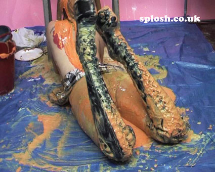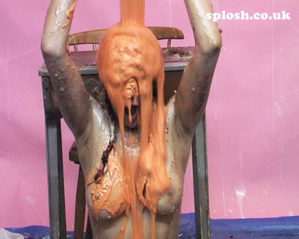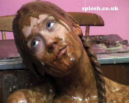 Then she starts to undress and coats her lovely young near-naked body in more gunge, thick chocolate and treacle before rolling around on the goo-drenched floor playing with herself happily.