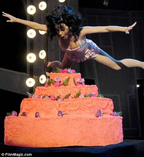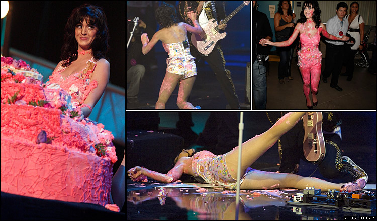 Hawt singer Katy Perry stage-dived onto a giant cake at last night's MTV Latin America awards.