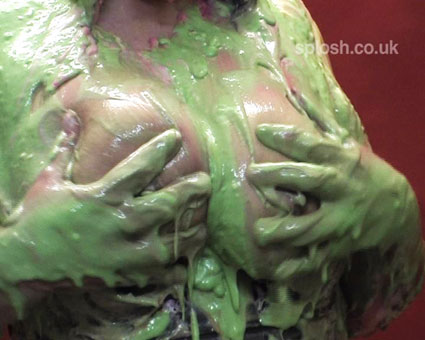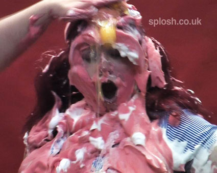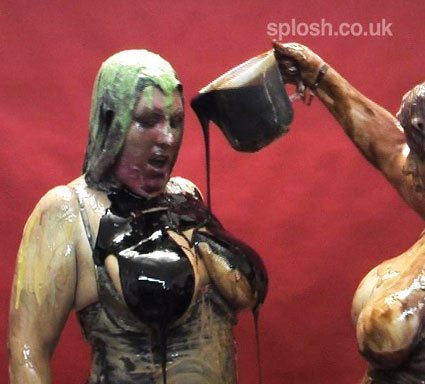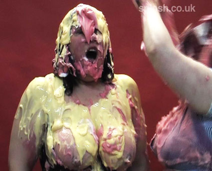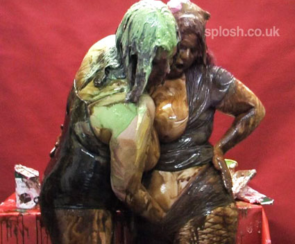 It started out with Big, Firm Favourites Candy Custard & Decadent Doll meeting for the first time at the SPLOSH! Studio to take part in a sketch based on the song "Anything You Can Do..." Both were in their best cavernous cleavage outfits, and soon a fine tit-for-tat battle with pies, eggs, custard, chocolate & treacle and clearly enjoying taking it in turns to mess one another up...