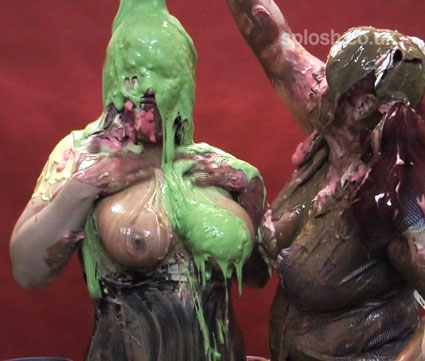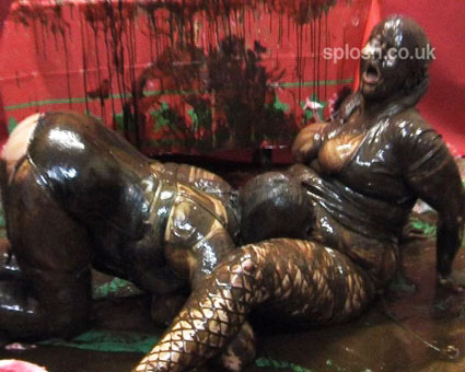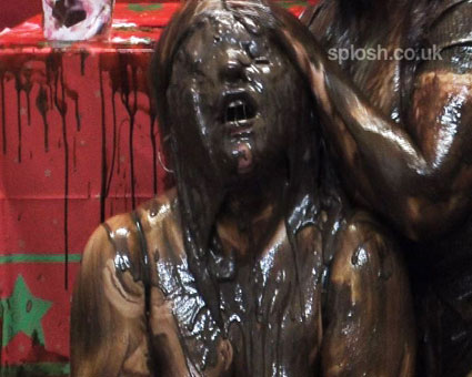 Then as the rubbing continued, the girls got on the floor to dunk each other's heads into a trough of thick chocolate pudding - only they didn't stop! Both breathing hard and clearly loving what they were doing to each other, they repeatedly plunged each other into the brown mess.