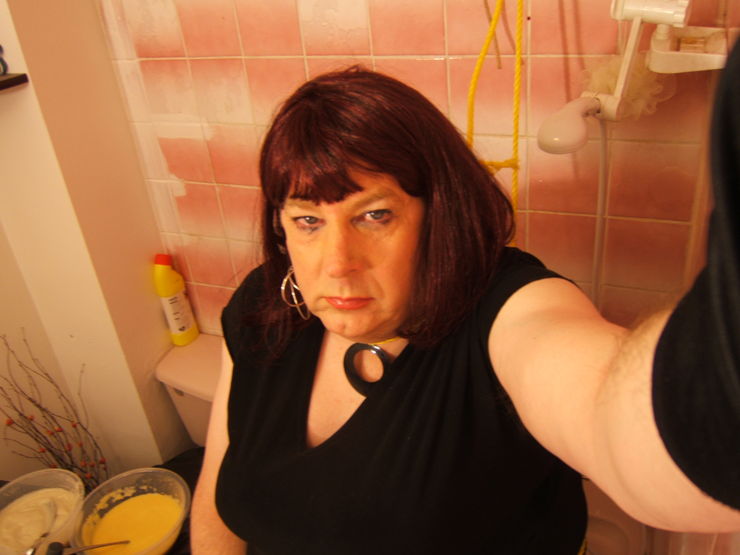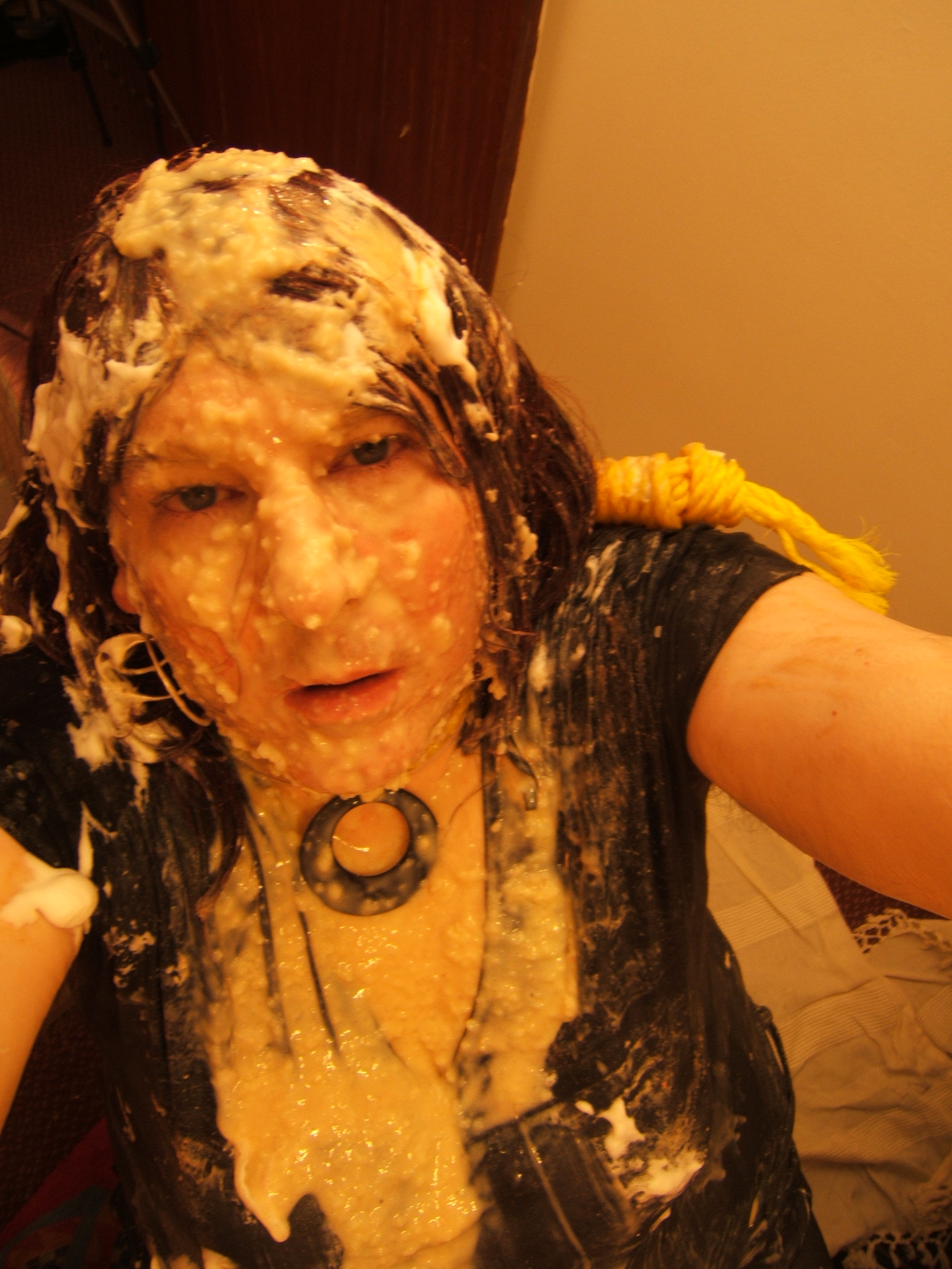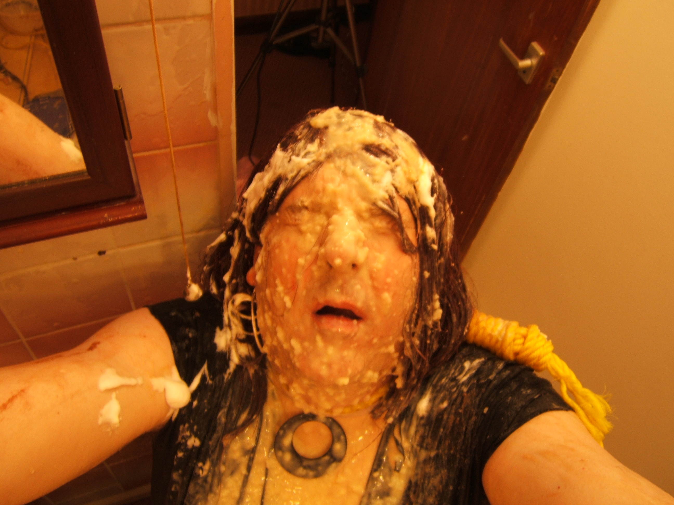 I am with Hayley on loving messy S&M humiliation, so extreme messiness started wth a few jugs of cold water over my head and outfit, eggs cracked onto me and included head gunging, knickerfilling and loads down my cleavage and over the opaques and some "cum" facials from the squeezy- I got this idea from the Freaks of Cock freebies