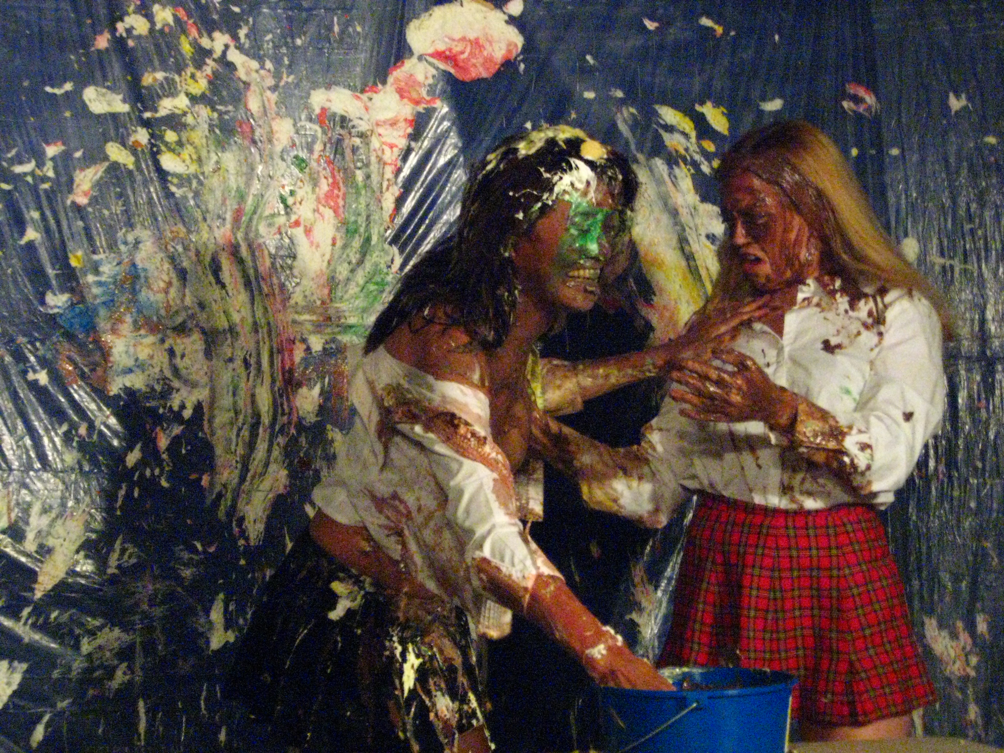 When schoolgirl Maddy decided to give the hottest boy in class a messy birthday present there was just one problem: he already had a girlfriend!! And when she chanced upon our saucy student slathering her hunk in goo the result wasn't pretty - possibly one of the greatest messy catfights in wamming history - the two girls trashing each other (and practically destroying the studioas well!!) before the girlfriend - Suzannah - bent Maddy over to 'do' her with a strap on, whereupon our hunky hero returns and gets her to suck him off at the same time!! There's an ending which will have you laughing your socks off as well...