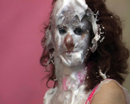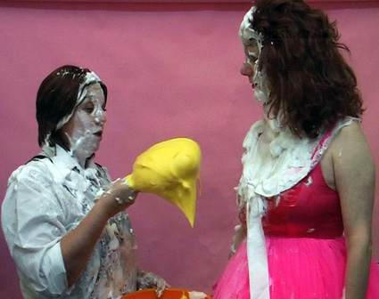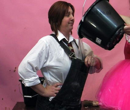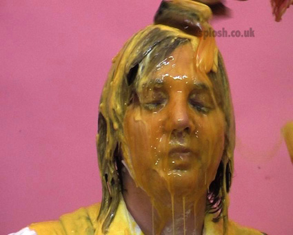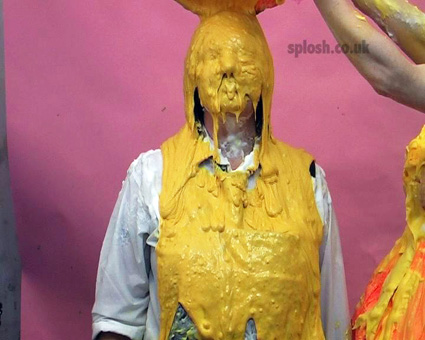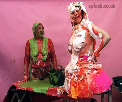 Julie has asked Sammy to help redecorate the Splosh! studio but it isn't long before the trouble starts. First Sammy is soaped and soaked as her dungarees are filled with water, then Clown Julie is pasted with slosh. Then after Sammy is pasted as well, they set too with the yellow paint both ending up covered head-to-toe before Sammy has her face and hair treated to a sticky going over with glue, leading her to respond with a pie barrage to Julie's face and bare boobs.