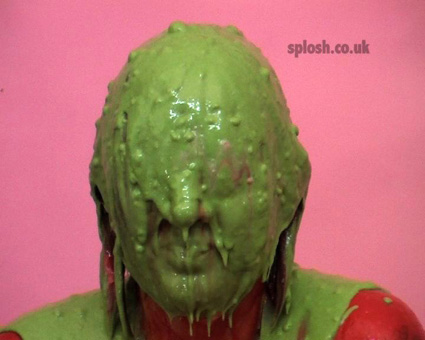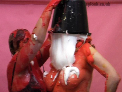 Sammy is next on the receiving end with topless coverage in thick red paint including inside her tights before dumping a full bucket of slosh on Clown Julie's head. Finally Sammy has her head dunked repeatedly in thick lumpy green gunge, then it poured over her so they (and the studio) end up completely wrecked.