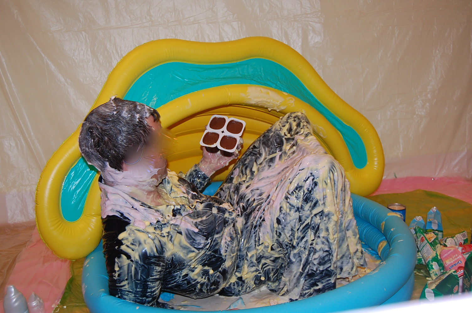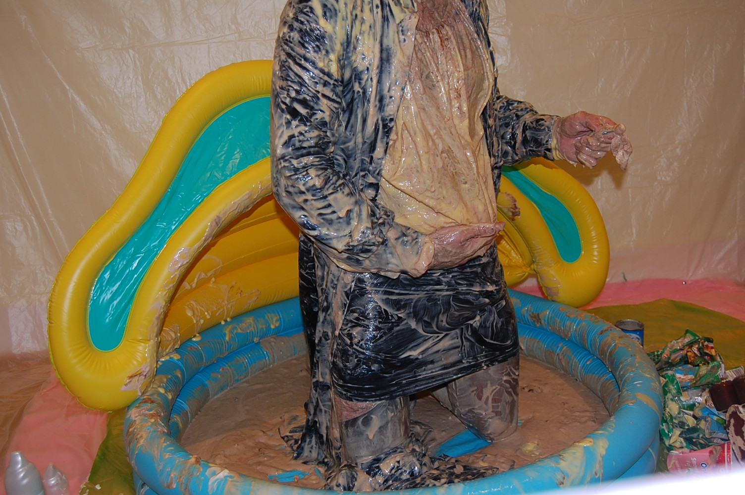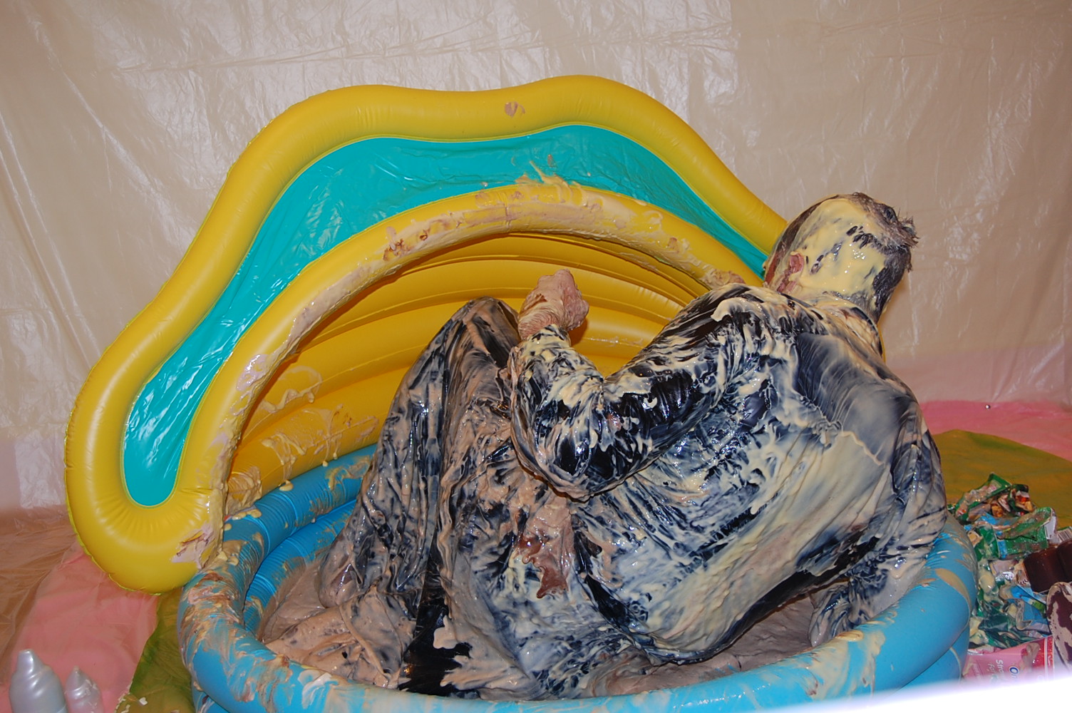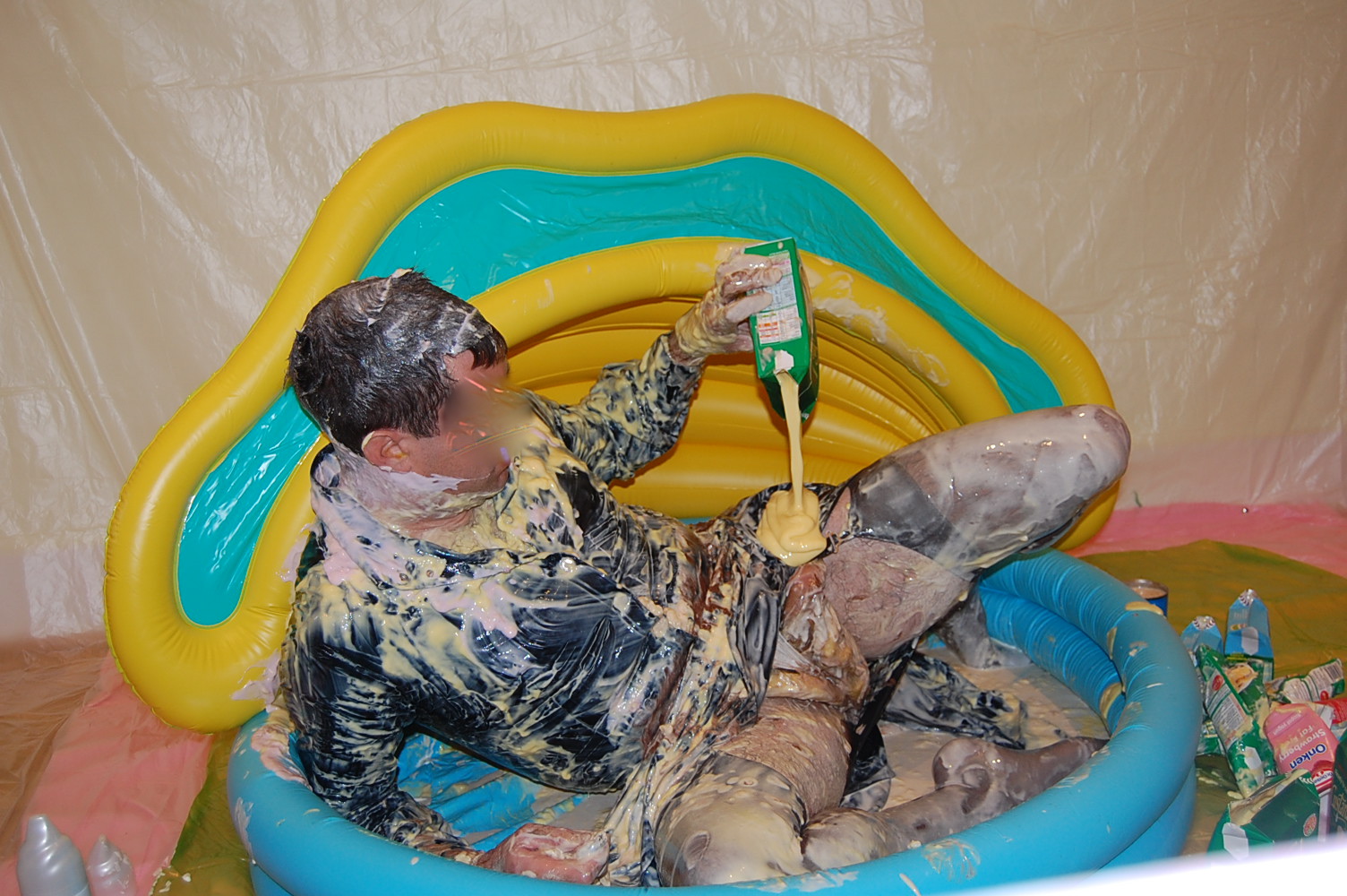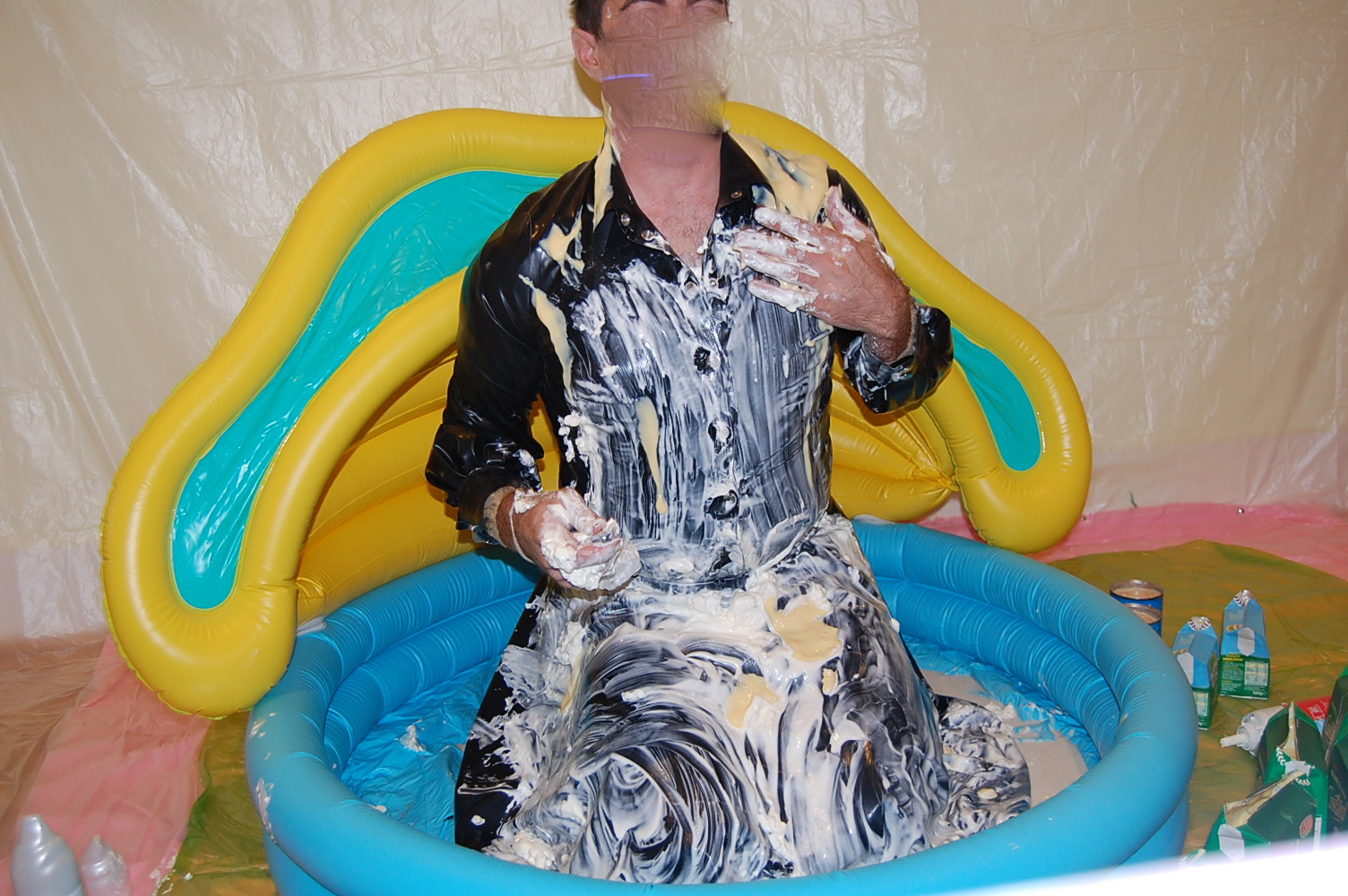 Here's a few shots of me dressed in clear plastic underwear and a few layers of lovely shiny rubber. This is the result when you have plenty of splosh gunge, a paddling pool and a camera remote control. Would love to find someone to remove the need for a remote control......