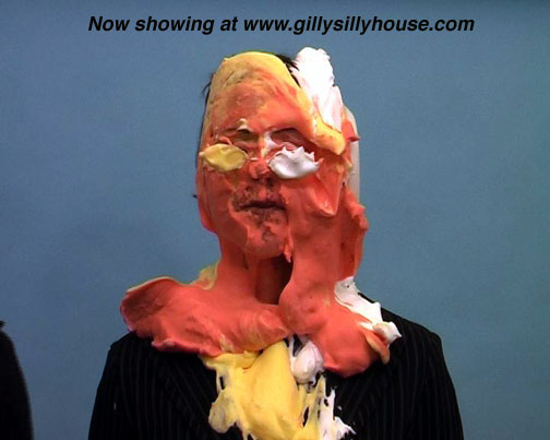 If you are a fan of the slapstick style of Gilly's Silly House, (and have no issues with Facebook!) you really should join Gilly's Silly Housemates the official Facebook Fan Page. You can leave messages on the wall there, chat and we are starting up a photo archive from her classic messy films. We start with 20 pictures from The Pie Apprentice, Gilly's parody of TV show The Apprentice only starring her and Hydee in fine pie throwing form! An example is below.