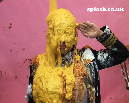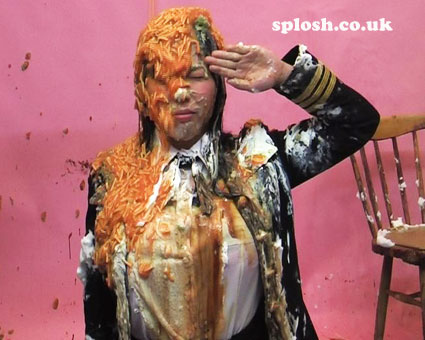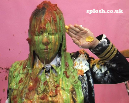 Dressed in a genuine US Navy uniform, blouse and tie, the real life submissive is completely deluged with water, eggs, beans, pies, ketchup, salad cream, custard, brown sauce, spaghetti, thick yellow gunge, thick green gunge, cream and chopped tomatoes - not to mention having mushy peas literally slapped in her face!