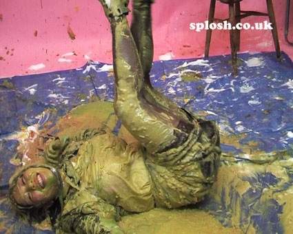 Despite all that she keeps her composure, staying at attention until the very end when she rolls around in the stinking pool of mixed mess on the floor, giggling away and loving every minute of the mess she's in!