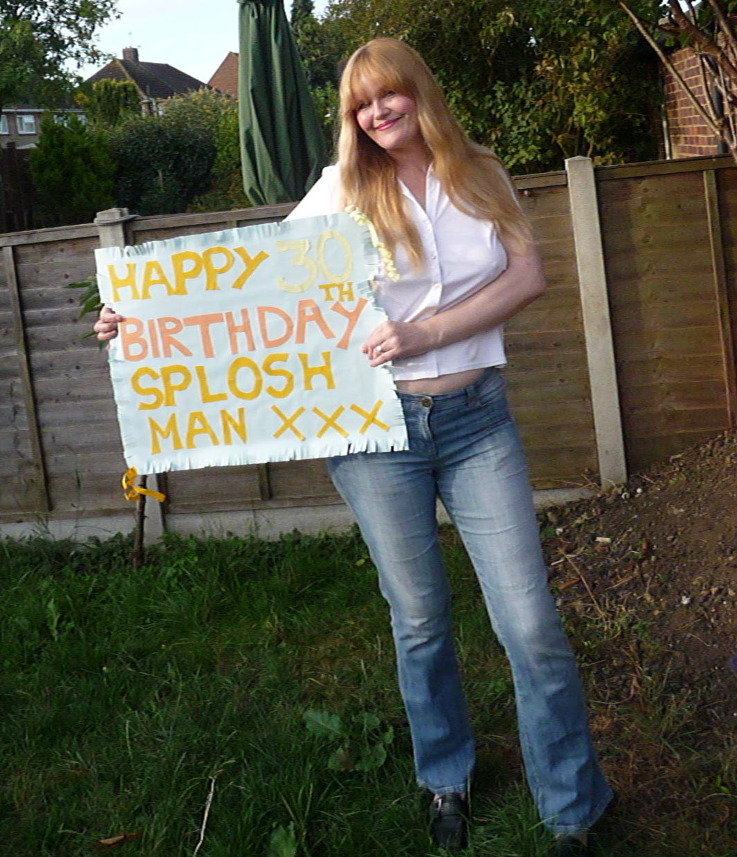 After a long dry seven months in Spain I have finally got some time off, so what better way to relax than celebrate Sploshman's birthday in my back garden! Just like the sign, this is all my own work (camera on a tripod on automatic) so I hope some of you like it. I know Sploshman - and probably the rest of you would rather it was chocolate or custard but that may have to wait till my next visit to Splosh House (I'm quite fussy about my place). In the meantime, I hope you don't think I have fallen apart too much since I last appeared.