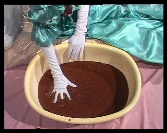 The stunning Amanda Hughes plays a snooty BBC style announcer in satin gown, gloves and white high heels who provides a very horny 'intermission' film with the aid of a deep bowl of clay! After slowly and sensously ruining her gown, shoes and gloves she strips off and covers herself - then naked and horny she starts playing with herself and fucking the pillow on her bed!