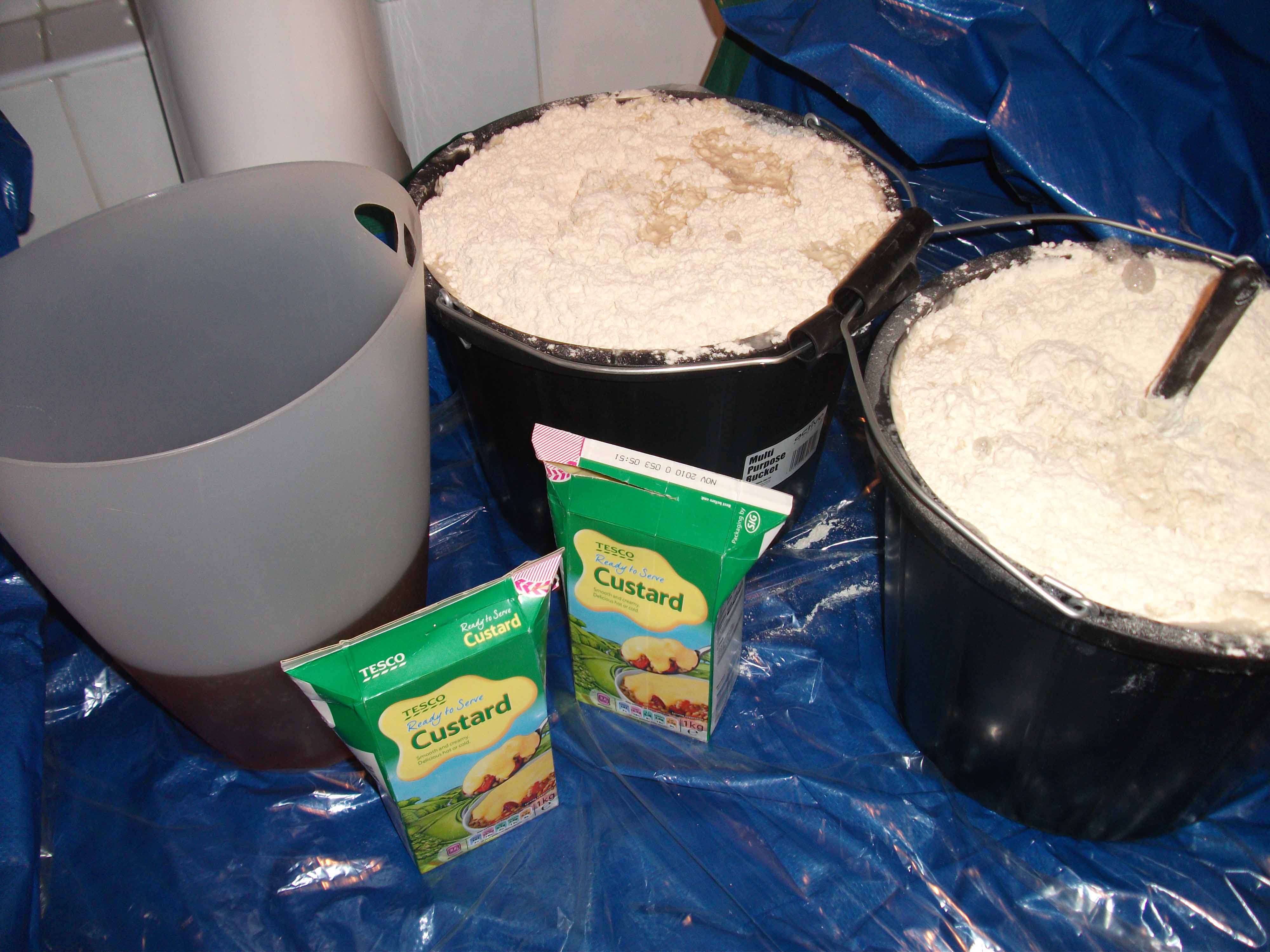 10 bags of flour mixed with water and shower gel ( so it washes off better)