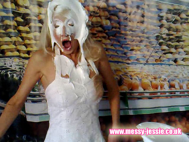 After rubbing chocolate into my top, she sprays it with something she promises will remove it. However, the stain gets worse and I get irrate! I rub cake into her dress, which just spurs on a big food fight!