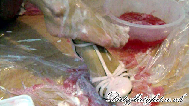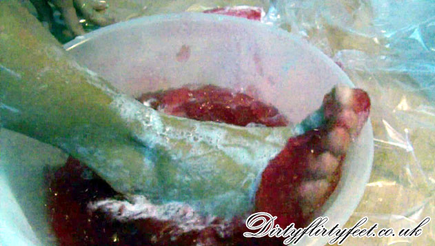 Yvie wears pretty pink Mary Janes and messes them up with red jelly and white ice cream. Once the shoes are messy, she puts her bare feet into the jelly and sqishes it around her toes before putting her feet into the cool ice cream!
