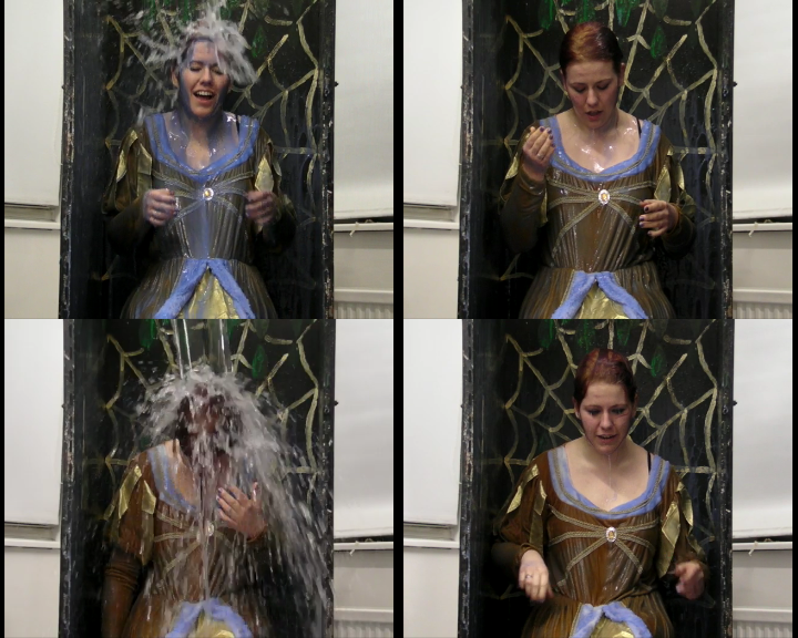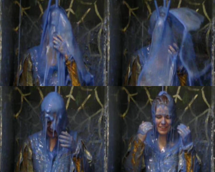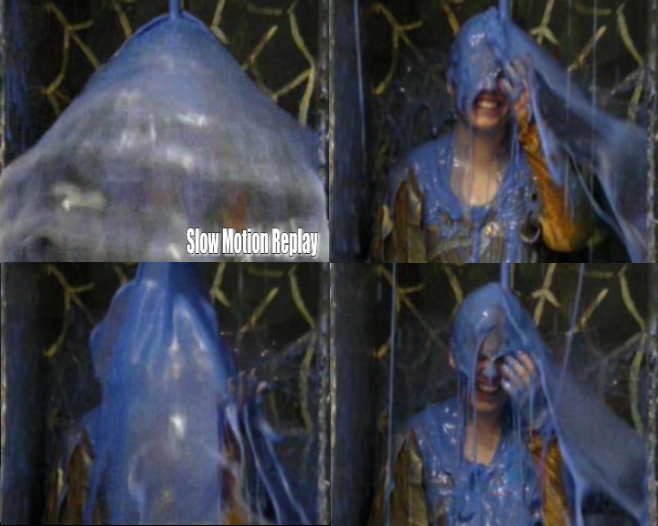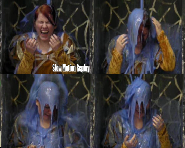This particular gunging is the only one shot in a costume. It was shot to get a second long clip during the narration in the opening titles to go with the centuries ago sliming fair maidens bit.