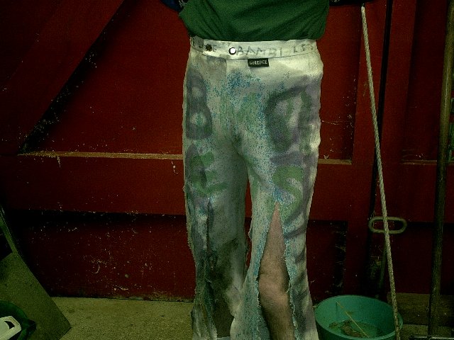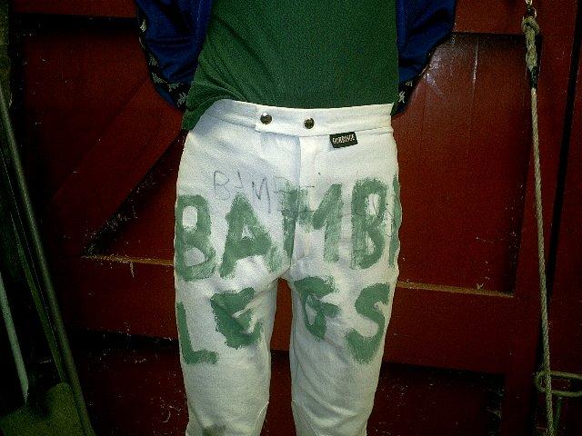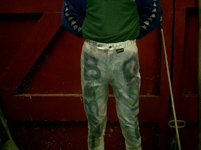 My friend tied my hands behind my back with a headcollar, then found a marker pen and wrote on my jods, but the pen had almost run out. Rummaging around in the junk (nothing had been prepared, she just used what she could find), some horrible green paint was found which she painted 'bambi legs' across my jods with. This was her 'theme', which she wouldn't let up with, and when some spray paint was found that is what she continued to write on my jods. Some hoof oil was found in a tub, there wasn't much left so it was rubbed over my jods. Then some blue spray stuff was found, there was no pressure in the tin and it took some vigourous shaking to get it to come out and go over me.The front and back were treated the same.