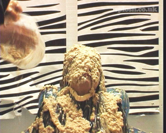 However, her biggest indignity came by accident. Her rubber maid's dress slippery with oil and margerine and still bound hand and foot, she then slid off the chair a full 10 foot along the floor crashing into the camera tripod.