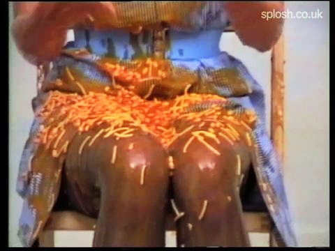 Deluged with both savoury and sweet food (including spaghetti, soup, porridge and three types of custard), pied ("Wow! I've always wanted somebody to do that!"), her panties filled front and back with rice pudding, and then taking over to cover herself in cream, this is an excellent example of just how happy and horny getting messy can make someone. Even she was surprised how good it was!
