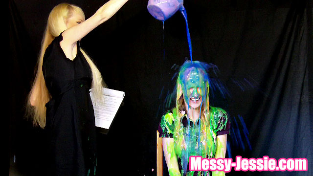 How did she do? Not too well... 4 out 10 right, so she got gunged 6 times! Pink, blue, green and orange slime all over her nice shirt and smart trousers!