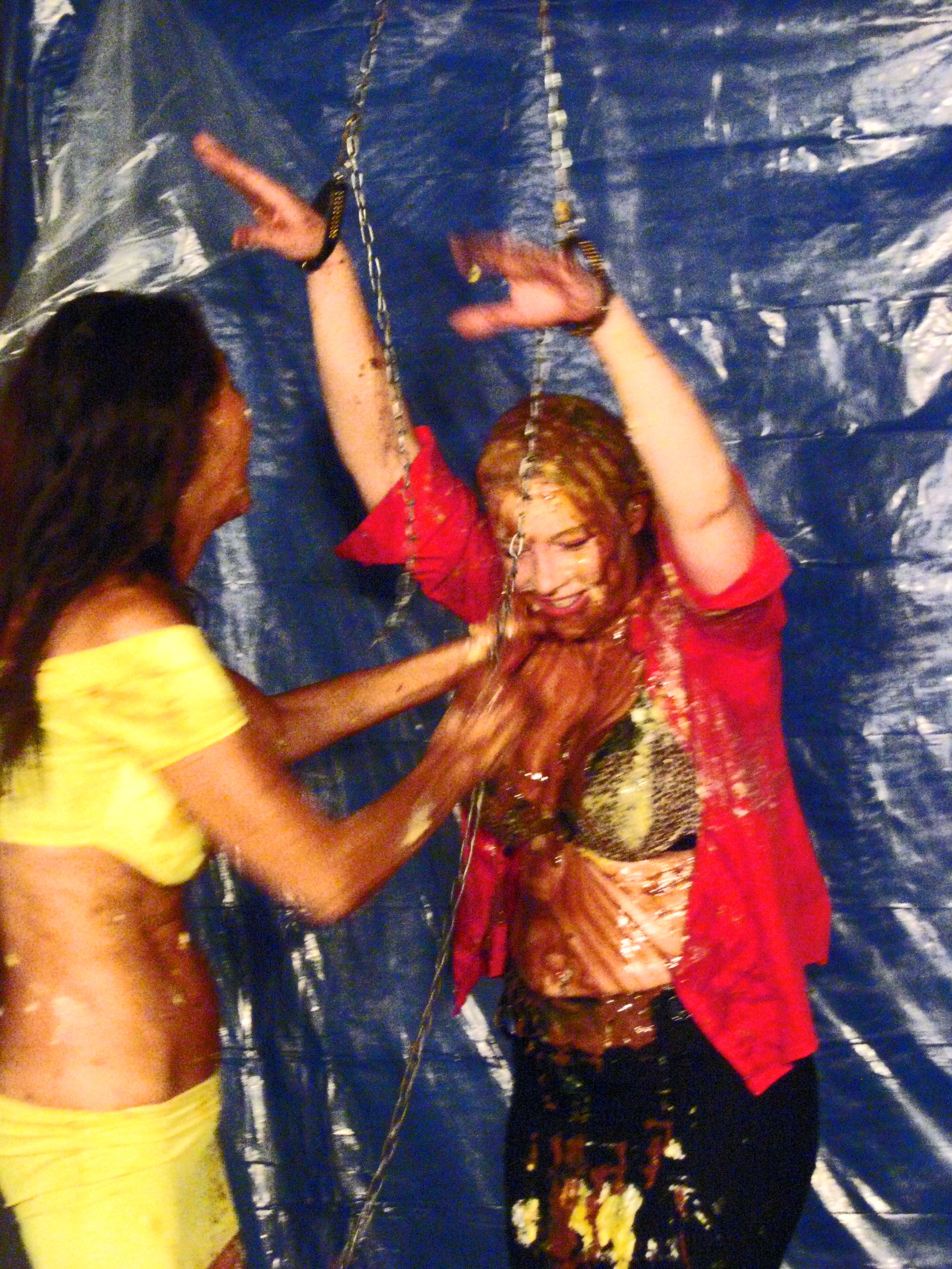 As you may know I've been devoting a lot of my time lately to initiating some of my slutty friends into the messy arts for my other site http://www.messtheboss.com and whilst I've had the untold delight of slathering them with pies and gunge and all manner of other disgusting substances I've missed being on the receiving end myself. So the other day I returned to the studio, eager to make up for lost time, only to find that one of those awful business consultants was sitting at my desk! It turned out this big-titted blonde had moved into the office with a view to turning MessyMaddy.com over to a site for household recipes (how to make the perfect cupcake, for example, or ten handy hints to making a mouth-watering lemon meringue pie, blah blah blah.) Naturally I told her that was utter bullshit - as far as I was concerned cakes were for throwing! Anyway, that led to a little disagreement, and somewhere along the line the little bitch got lemon meringue all over her pretty face and long hair, and smeared across her mighty mammaries, and once she started complaining I really had little choice but to tie her up and crack eggs over her head and into her panties - whereupon (to my surprise of course!) the whole thing degenerated into a massive food fight with pies to the face, pussy and backside, and yogurt and chocolate pudding being smeared all over each other`s bodies, until I am ashamed to say we both got so horny that we ended up licking and sucking and rubbing the stuff all over each other. And that was when the office manager showed up, and as you can imagine he was pretty upset to find the place trashed, and so he bent Prissy-Missy over the desk and fucked her pretty hard, which would have been boring for me were I not able to cover her in syrup while he was doing it! But the punishment didn't end there, because once he'd finished with her he threw me across the desk and fucked the shit out of me too! And just as he was reaching a climax that little slut decided to get her own back and slammed a huge chocolate cake straight in my face! I won't tell you how it all ended because I would hate to spoil the surprise, and anyway you can find out for yourself right here and right now: