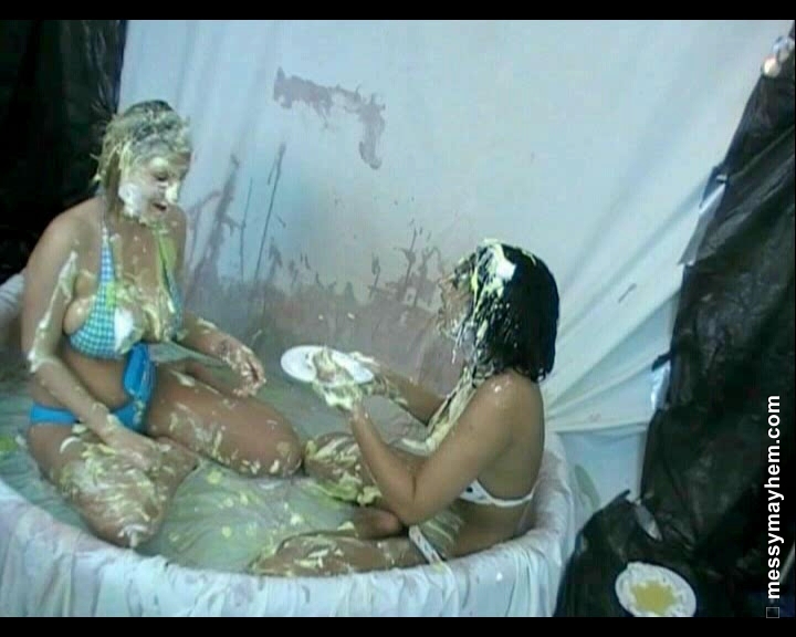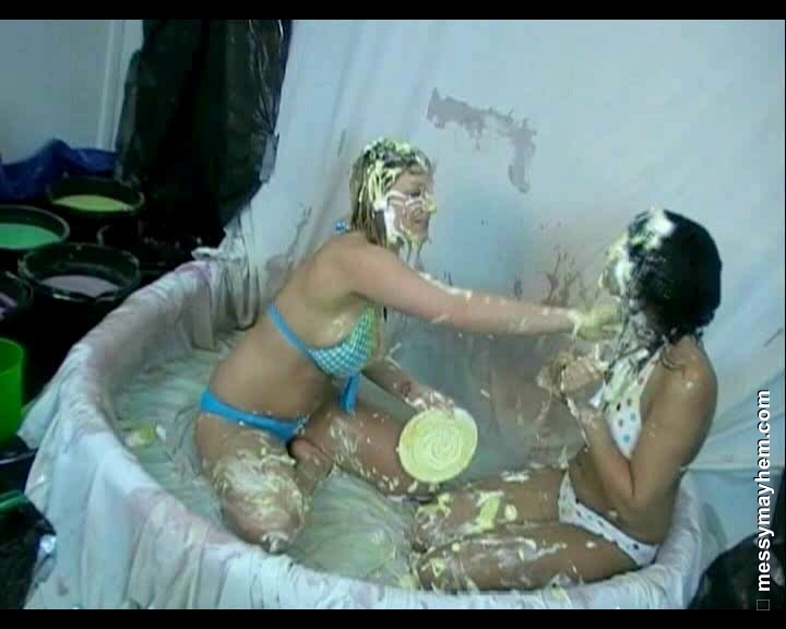 Pass the parcel, that demure game played by children at parties but what happens when you replace the parcel with some custard pies and the children with the gorgeous chocolate skinned Nicole and big boobed mega loon Demi Scott.....absolute chaos and a lot of mess! That’s exactly what happens in Episode 17 Part one which has just made its way into the download store on http://www.messymayhem.com