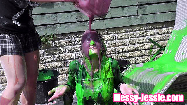 The winner gets to gunge the loser with a big bucket of bright green gunge! And as usual with Kelsey, I lose! So I get covered in green gunge from head to toe. And as it's such a lovely day, I have a little roll around in the slime after, with the help of Kelsey!