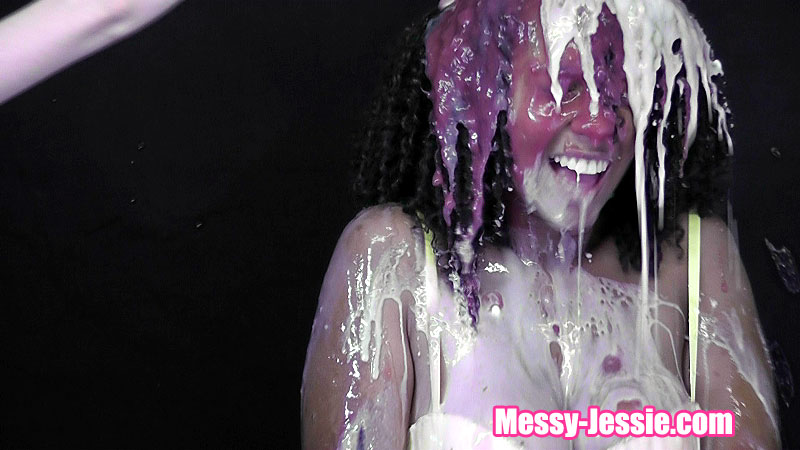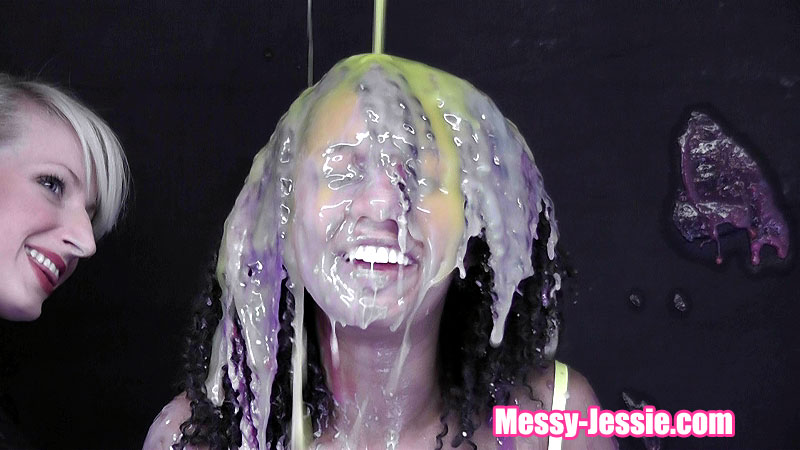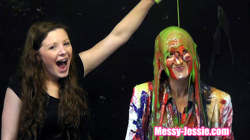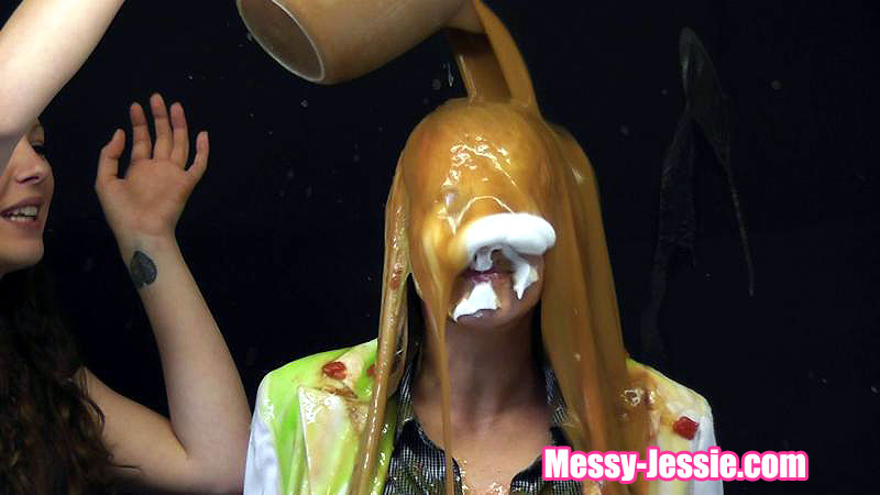 In my white suit, Nadia takes her turn at my favourite game! She starts with some pretty pink slime, custard and green gunge. That is all lovely but then she moves on to some rather less pleasant things... Beans, chopped tomatoes and more gravy!