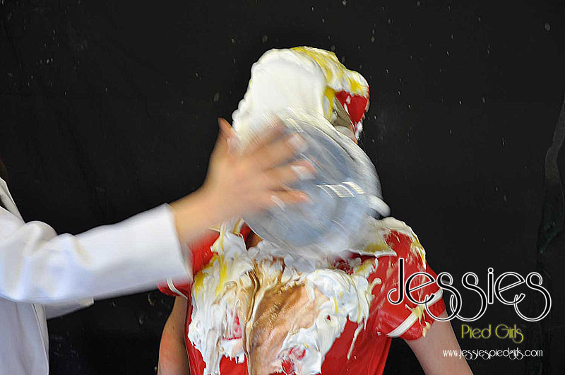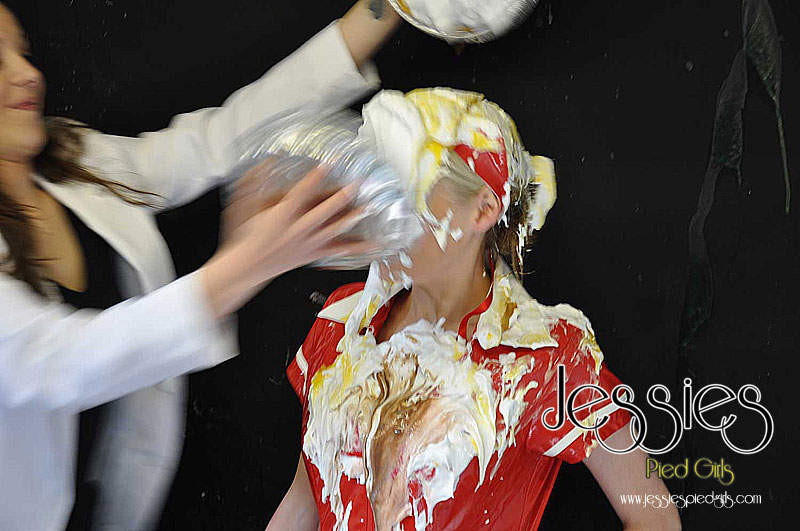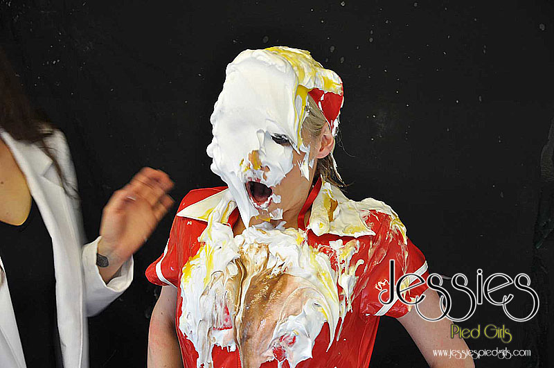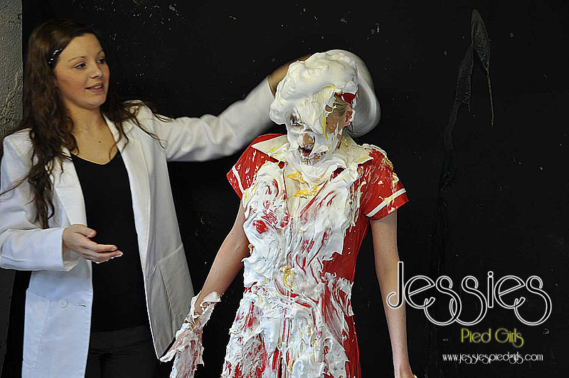 Naughty Nurse Jessie, was late for work and hasn't done her duites, so Dr Nadia punishes her with pies! Lots of nicely filled pies all over Jessies face, hair and pvc uniform!