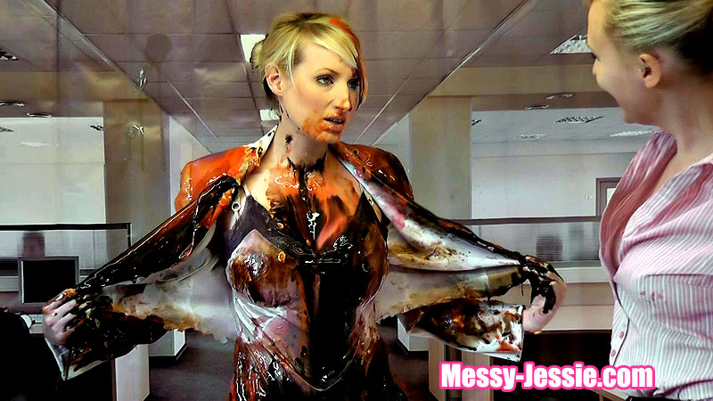 Cherry pours black treacle and chocolate sauce all ove my and my suit and then she gets the scissors out! Cherry cuts the jacket all the way around and then starts covering me with spaghetti hoops! Then she throws on some bright orange slime and black paint! By now, my suit is pretty much beyond repair, but my trousers aren't too bad... So Cherry cuts the legs off to make them into shorts. There really was no going back now.