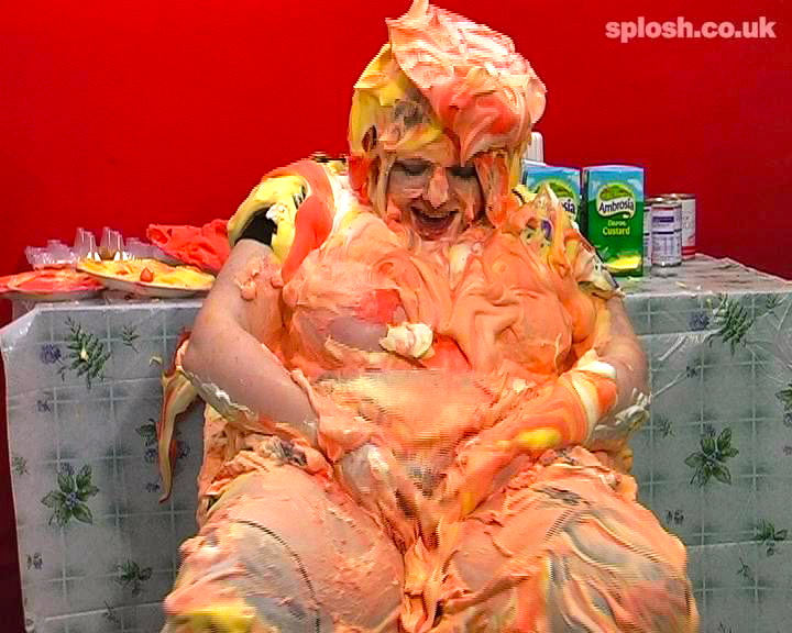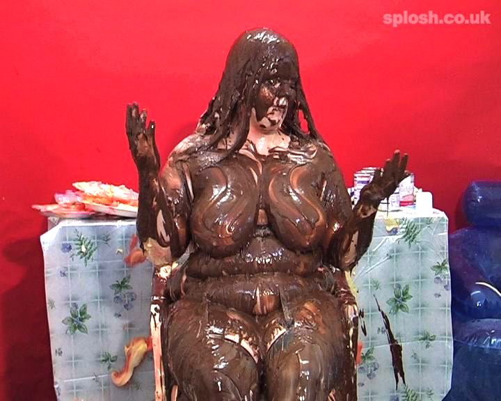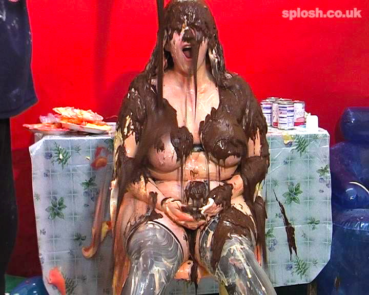 Stripping down to her knickers and stockings, Dolly is then coated with custard before having her knickers filled front and back with rice pudding for a massive wedgie that has her shuddering with delight. Then more custard and cream before she is deluged with a huge bucket of chocolate that engulfs even ample Dolly's doodahs. No wonder she can't resist rubbing it all in.