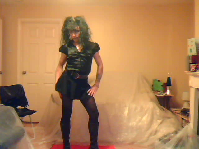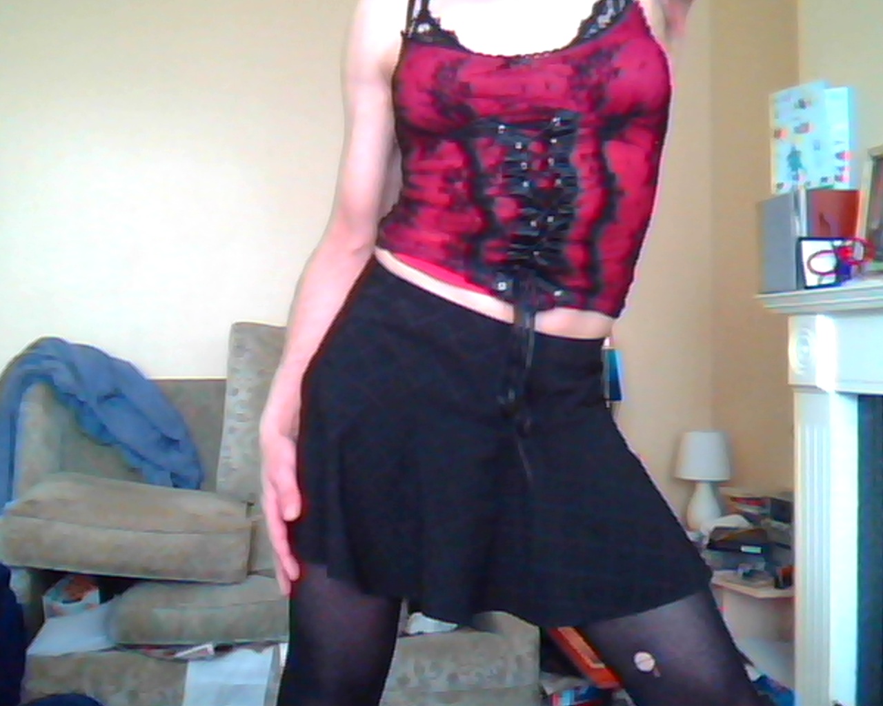 Dressed in a little skirt,black satin blouse,red basque,black stockings,suspenders,bra,knickers & knee high boots.